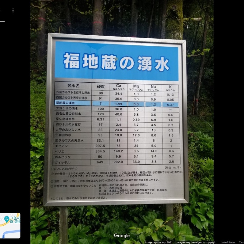 【福地蔵の湧水】(愛媛県の湧水)上浮穴郡久万高原町 飲むと健康になるという 日本で指折りの超軟水 [湧水の名称] 福地蔵の湧水(ふくじぞうのゆうすい) [場所] 愛媛県上浮穴郡久万高原町 [言い伝え・概要] 福地蔵にお参りすれば健康で過ごせると言い伝えられており、そこに湧く水にも御利益を感じる人が多くいます。 [保全活動] [Google クチコミ] こちら 出典 環境省ホームページ お気に入りに追加※自然の湧水は煮沸して飲用されるとより安全です。※水辺は水難や危険生物に十分気を付けてください。 Click to share on X (新しいウィンドウで開きます) X このエントリーをLINEで送る (新しいウィンドウで開きます) LINEに送る Facebook で共有するにはクリックしてください (新しいウィンドウで開きます) Facebook このエントリーをはてなブックマークに追加 (新しいウィンドウで開きます) はてなブックマーク (パワースポット)地蔵 | (種類)超軟水 上浮穴郡 | 久万高原町 | 愛媛県 | 四国 投稿日: 2021年3月15日2023年6月21日 投稿者: Sumai事務局