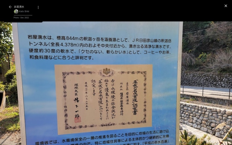 | [言い伝え・概要] | 岩屋湧水は、JR日田彦山線の釈迦岳トンネルから湧き出しており1日の湧水量は15,000トンで地域住民や森林保全団体による環境整備が行なわれ、地域からも親しまれている場所である。