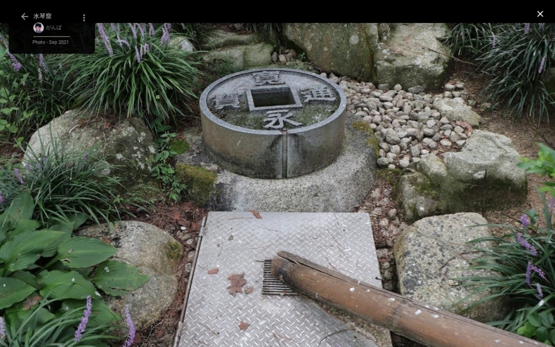 広大な園内には海、山、神社仏閣、史跡などがあり、「日本の歴史公園100選」にも選出されています。 自然や歴史を一日中満喫できる観音寺市の人気観光地です。 【水琴窟】 地中に埋められた瓶(かめ)の中に落ちる水滴が、琴を奏でるような風雅な音色を響かせます。 浴日館休憩所のすぐそばにあります。 |
