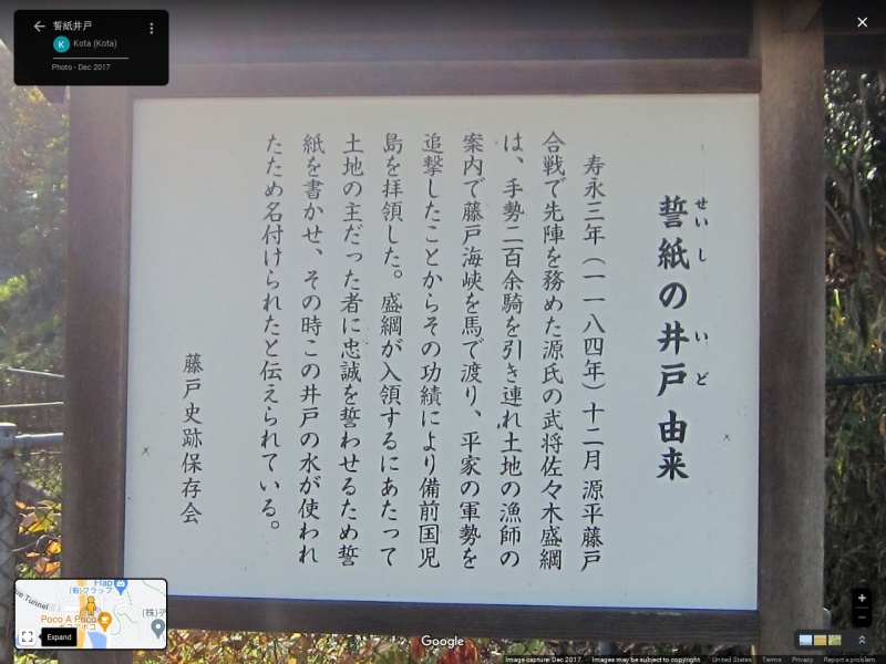 【誓紙の井戸】(岡山県の湧水)倉敷市粒江 源平合戦の史跡 源氏の先陣・佐々木盛綱が入国後手始めに行った治政の場所 [名称] 誓紙の井戸(せいしのいど) [場所] 岡山県倉敷市粒江 [言い伝え・概要] 清滝にある「七つ池」の下(北側)に、この井戸がある。 源平藤戸合戦後、佐々木盛綱が当地に入国した時に、地区の代表者を集め、「誓いのことば」を書かせた際、この水を使ったという。 [保全活動] [Google クチコミ] こちら 出典 岡山県 お気に入りに追加※自然の湧水は煮沸して飲用されるとより安全です。※水辺は水難や危険生物に十分気を付けてください。 Click to share on X (新しいウィンドウで開きます) X このエントリーをLINEで送る (新しいウィンドウで開きます) LINEに送る Facebook で共有するにはクリックしてください (新しいウィンドウで開きます) Facebook このエントリーをはてなブックマークに追加 (新しいウィンドウで開きます) はてなブックマーク (名水・名勝)源平合戦 岡山県 | 倉敷市 | 中国 投稿日: 2023年7月1日 投稿者: Sumai事務局
