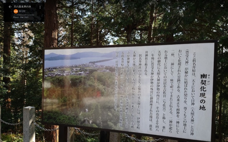 | [言い伝え・概要] | 伊勢神宮のふるさと・元伊勢籠神社(このじんじゃ)の奥宮である真名井神社(まないじんじゃ)にある名水。