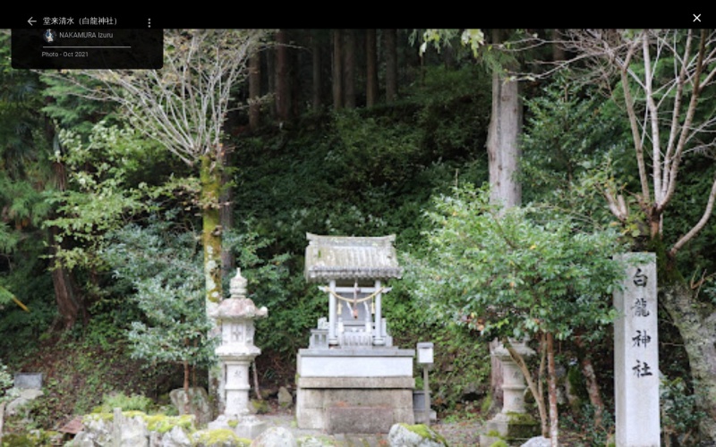 水源の「奥の池(夜叉が池)」は、今から1,100年以上前、干ばつで農民が餓死寸前に追い込まれたとき、野瀬の天吉寺山の草庵の一つ、月の坊という寺の住職で、槻之坊が農民とともに奥の池に住む白龍という竜神に雨乞いをしたという。その頃から、麓の堂来に清水(湧水)が出るようになったという言い伝えがある。 |