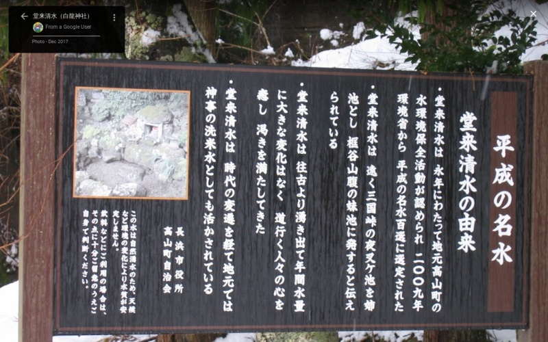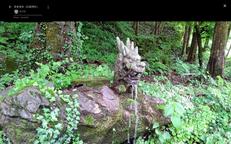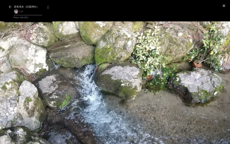 | [言い伝え・概要] | 古くから特に薬用水として多くの人々に飲用されてきた水量が豊富な湧水。「堂来地蔵尊」とともに信仰されている。地元では、五穀豊穣を願うお祭り「オコナイ(神事)」で使用するもち米を洗う神聖な水として使用されている。