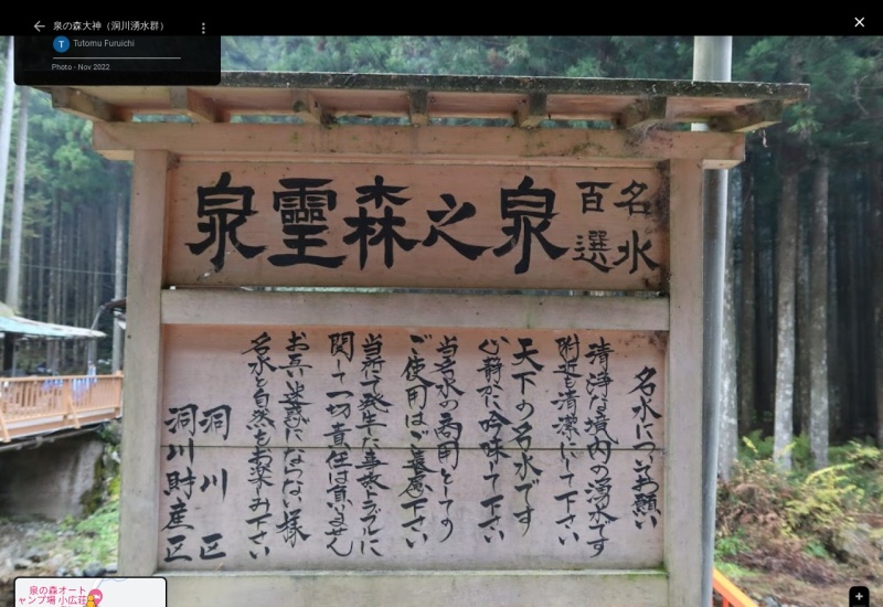 1985年7月、洞川湧水群の三箇所、泉の森、神泉洞、ごろごろ水のが日本名水百選に選ばれた。 一般の方の取水もたまに見受けられる。 近くにはキャンプ場があり、ホタルも見られるという。