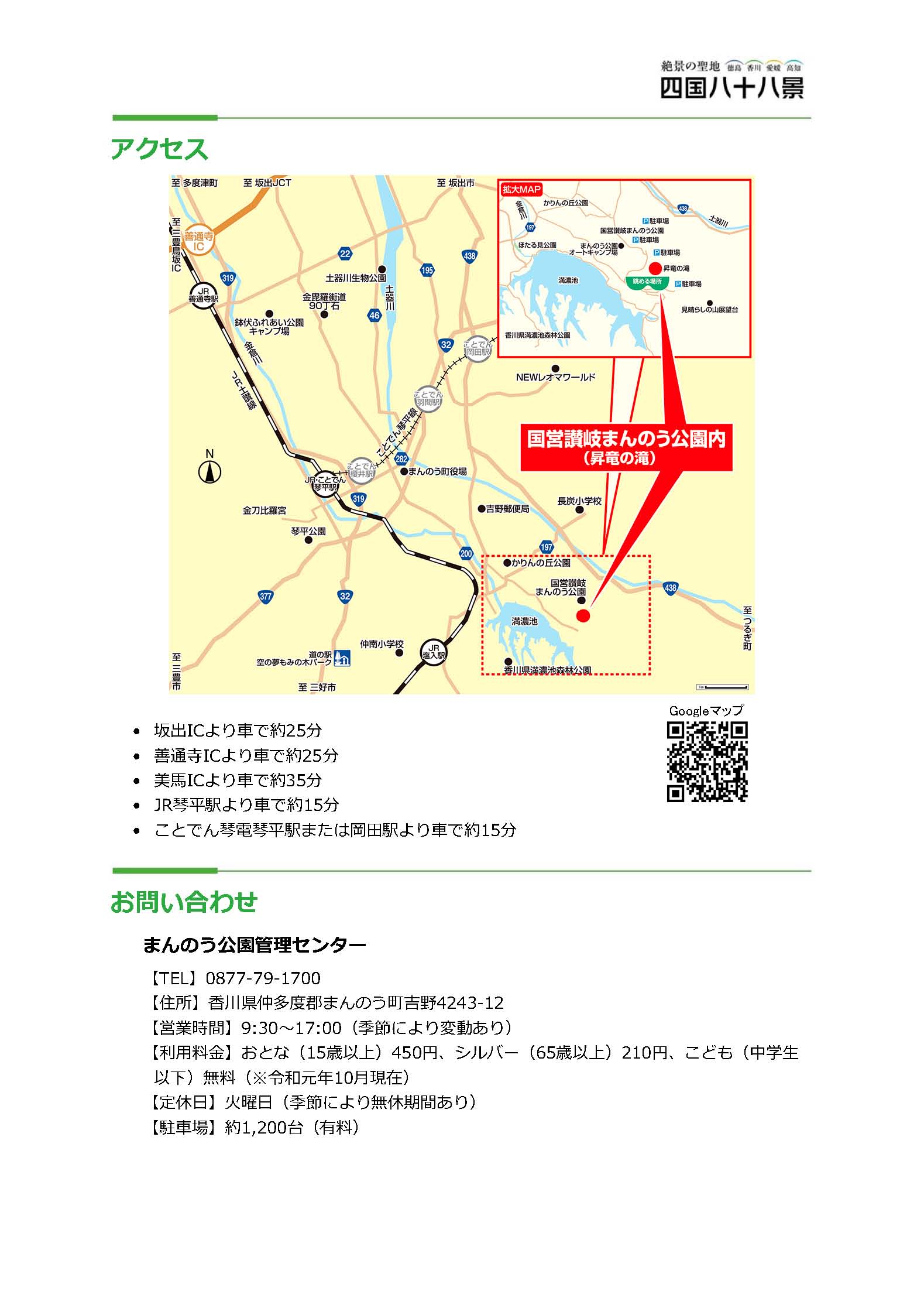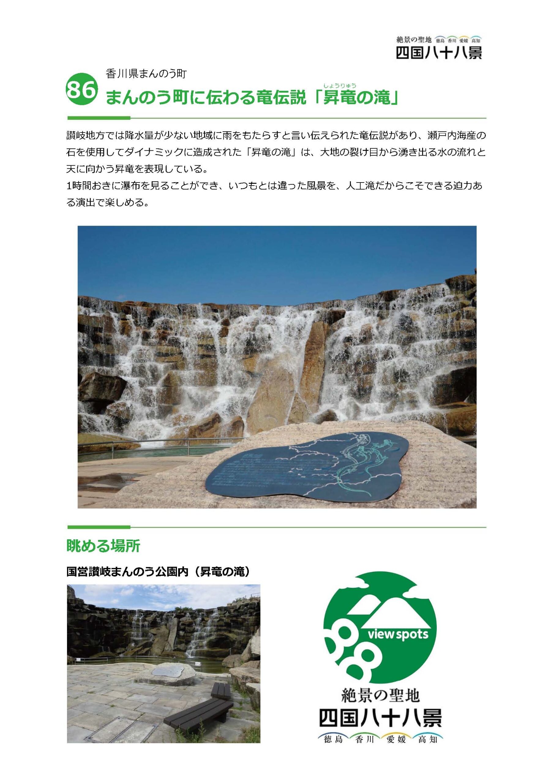【昇竜の滝】(香川県の水辺)仲多度郡まんのう町吉野 四国八十八景 毎時0分になると崖を伝って豪快に流れ落ちる人工滝 [名称] 昇竜の滝(しょうりゅうのたき) [場所] 香川県仲多度郡まんのう町吉野4243−12 [言い伝え・概要] 四国八十八景に選定された、国営讃岐まんのう公園の人工滝。 毎時00分(10:00より、閉園1時間前まで)になるとダイナミックな崖を伝って水が豪快に流れ落ちる。 [保全活動] [Google クチコミ] こちら 出典 四国八十八景実行委員会 お気に入りに追加※自然の湧水は煮沸して飲用されるとより安全です。※水辺は水難や危険生物に十分気を付けてください。 Click to share on X (新しいウィンドウで開きます) X このエントリーをLINEで送る (新しいウィンドウで開きます) LINEに送る Facebook で共有するにはクリックしてください (新しいウィンドウで開きます) Facebook このエントリーをはてなブックマークに追加 (新しいウィンドウで開きます) はてなブックマーク まんのう町 | 香川県 | 仲多度郡 | 四国 投稿日: 2023年7月11日2023年7月11日 投稿者: Sumai事務局