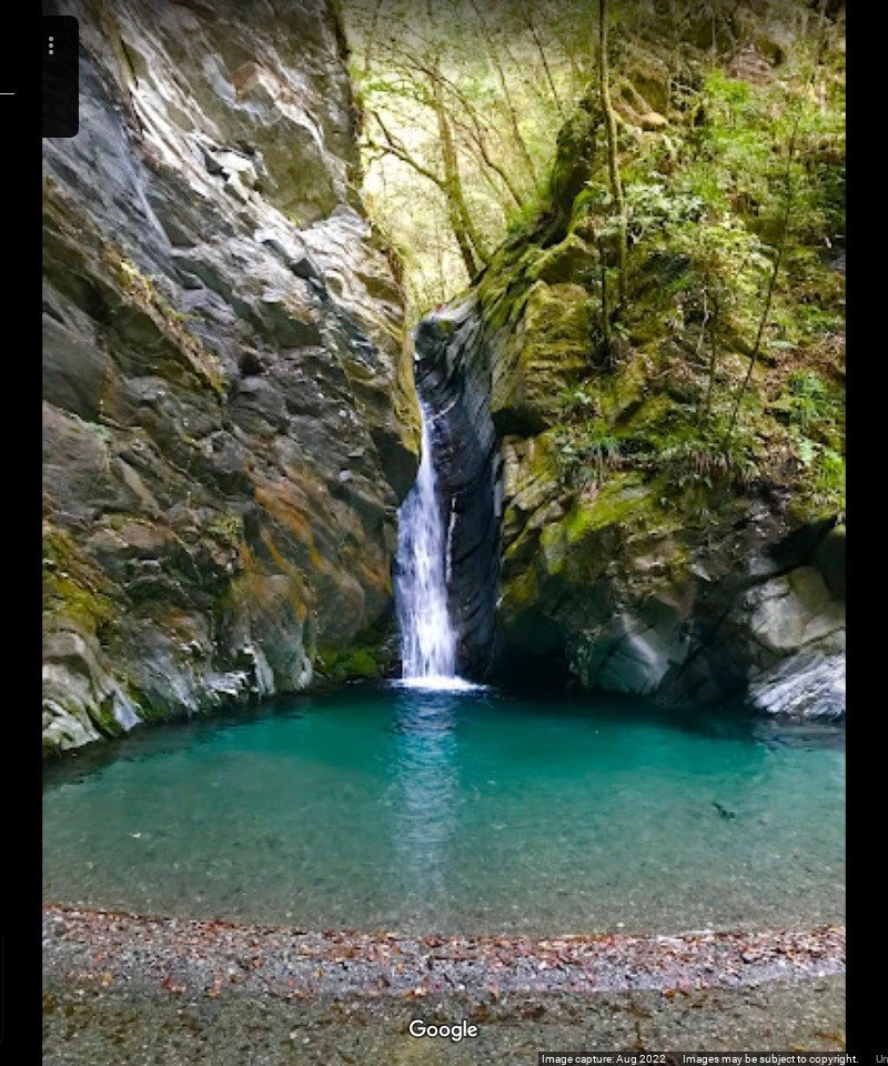 木漏れ日に照らされエメラルドグリーンに、時に淡いブルーにキラキラと輝く、県内随一とも称される美しい透明な滝壺で知られている。