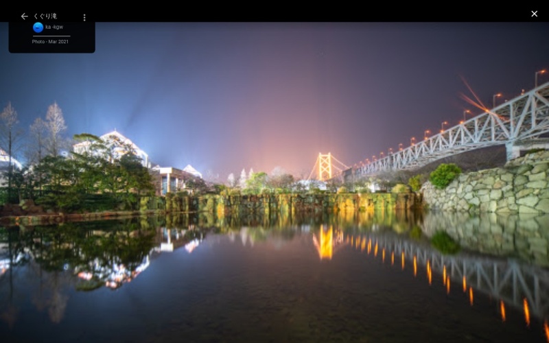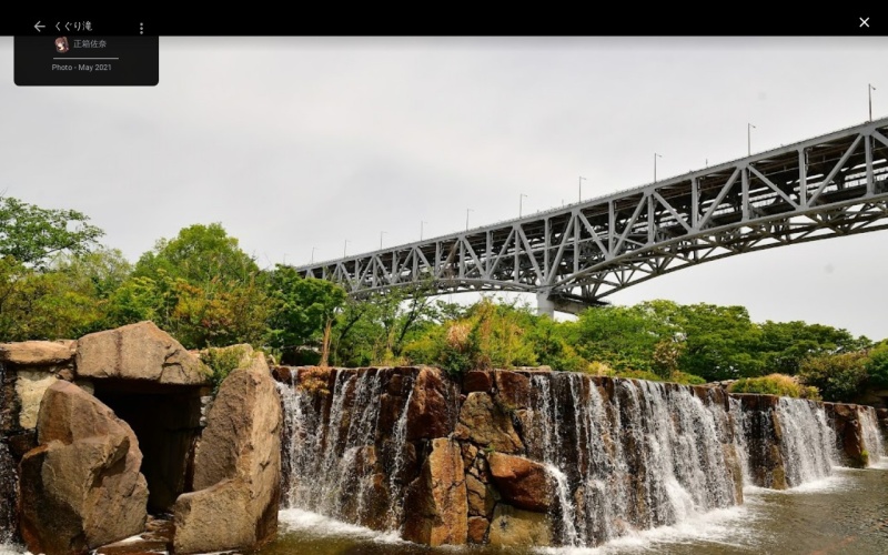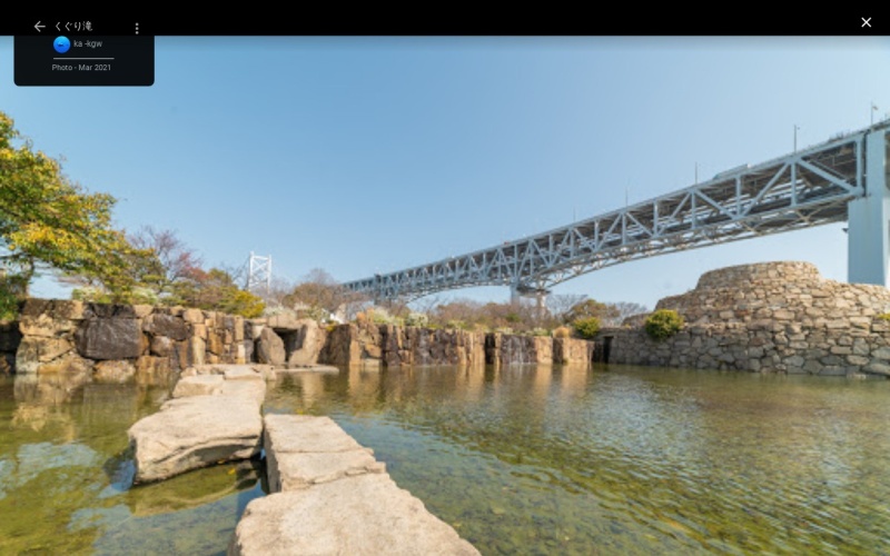 【くぐり滝】(香川県の水辺)坂出市番の州緑町 トンネルを抜けて石橋を渡ると 幅50mの滝と瀬戸大橋が望める公園