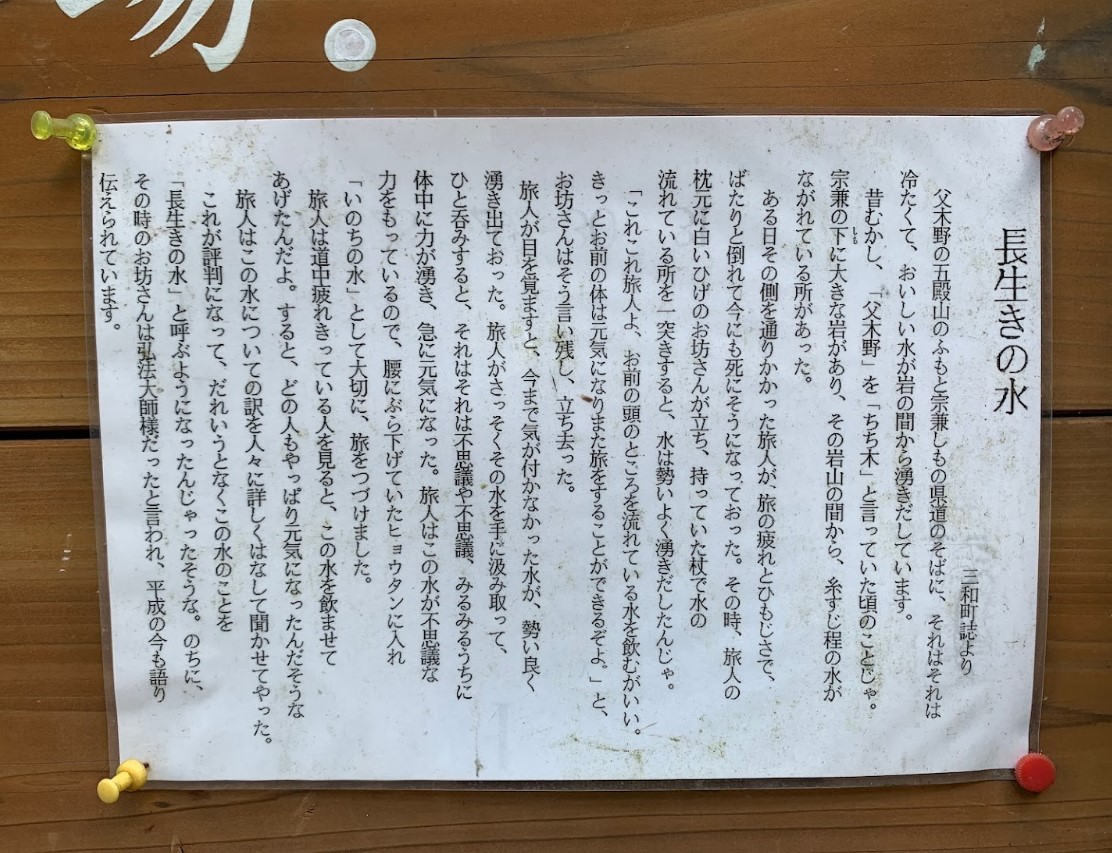 【長生きの水】広島県神石郡神石高原町父木野 弘法大師の杖の一突きで出たという 旅人たちの命を救った水 [名称] 長生きの水 [場所] 広島県神石郡神石高原町父木野 [言い伝え・概要] 父木野の五殿山の麓、県道沿いの岩間から湧出している水。 昔、疲れて動けなくなってしまった旅人の元に現れた弘法大師の杖の一突きで湧き出したと云われ、旅人たちの間で元気になると評判になり、いつの間にか「長生きの水」と呼ばれるようになったという。 [保全活動] [Google クチコミ] こちら お気に入りに追加※自然の湧水は煮沸して飲用されるとより安全です。※水辺は水難や危険生物に十分気を付けてください。 Click to share on X (新しいウィンドウで開きます) X このエントリーをLINEで送る (新しいウィンドウで開きます) LINEに送る Facebook で共有するにはクリックしてください (新しいウィンドウで開きます) Facebook このエントリーをはてなブックマークに追加 (新しいウィンドウで開きます) はてなブックマーク (人物)弘法大師 神石高原町 | 広島県 | 中国 | 神石郡 投稿日: 2023年7月28日 投稿者: Sumai事務局