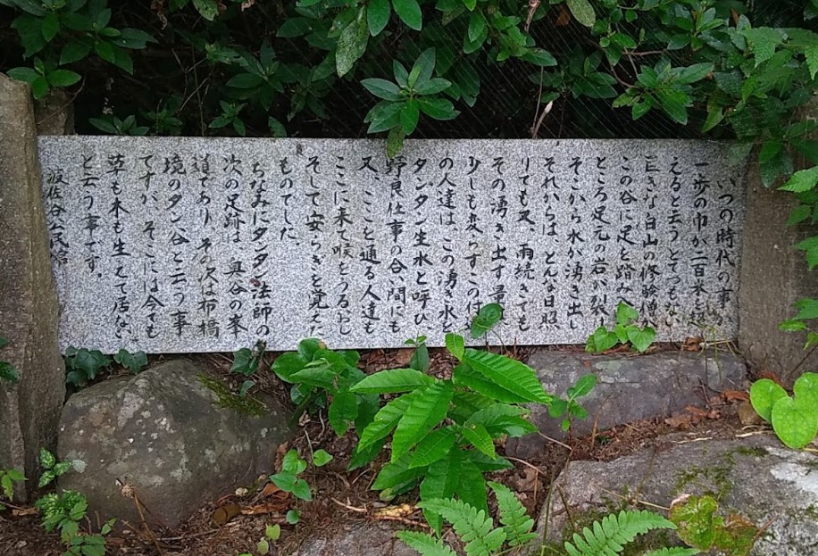 | [言い伝え・概要] | いつの時代の事か一歩の巾が二百米を超えるというとてつもない大きな白山の修練僧がこの谷に足を踏み入れたところ足元の石が裂け、そこから水が湧き出しそれからは、どんな日照りでも又、雨続きでもその湧き出す量は少しもかわらずこの付近の人達はこの湧き水を「タンタン生水」と呼び、野良仕事の合い間にもまた、ここを通る人達もここに来て喉をうるおしそして安らぎを覚えたものでした。