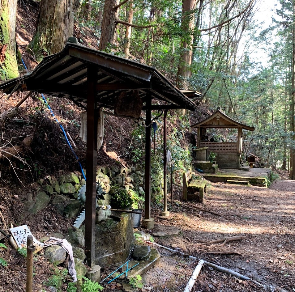 蛇形地蔵から三越峠へ向かう熊野古道迂回路を西方面に進んで徒歩10分程、開けた部分に簡易トイレと水汲み場が設置されている。