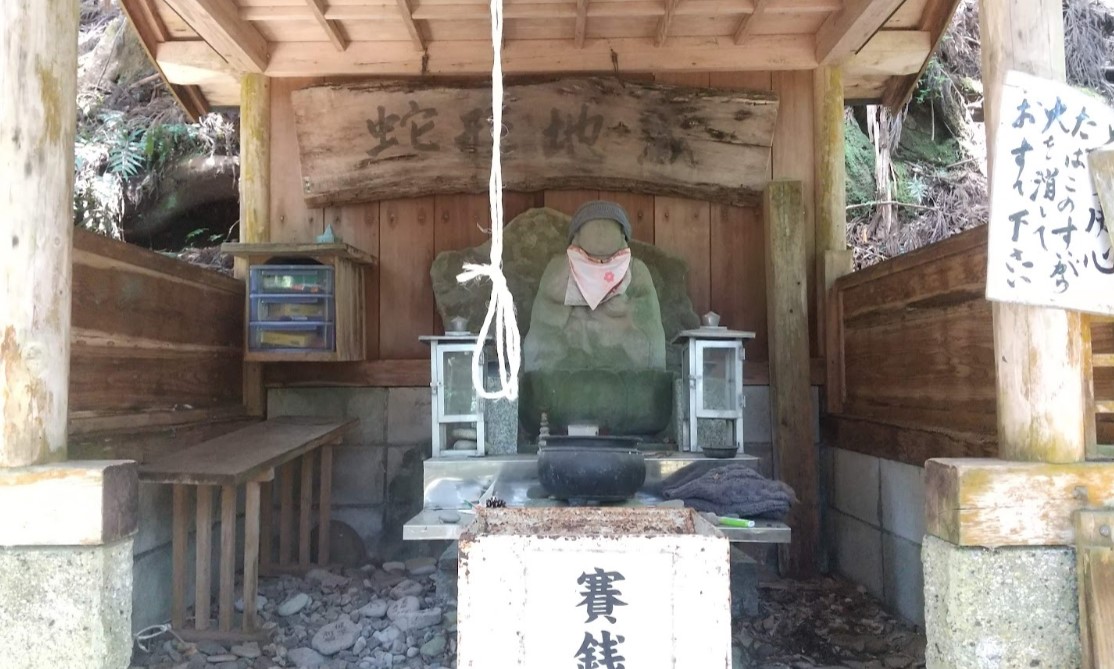 【蛇形地蔵】この付近で出土した海藻の化石が蛇の鱗のように見える事から「蛇形石」と名づけられ、それを背に置いて祀られているこの地蔵尊は「蛇形の地蔵さん」とも呼ばれ、明治22年の大水害以前は旧岩神峠にあったという。言い伝えによれば、熊野を往来する人々がよくこの峠で「ダル」という妖怪にとりつかれて倒れる遭難が相次いだため、寛政年代に岩神峠にこの地蔵尊を建てて旅人の遭難を防いだという。明治の大水害時には、岩神峠から不思議な音が聞こえ、村民は脱出し遭難をまぬがれ、そこで地蔵尊をここにお迎えし、祀ったという。(田辺市)