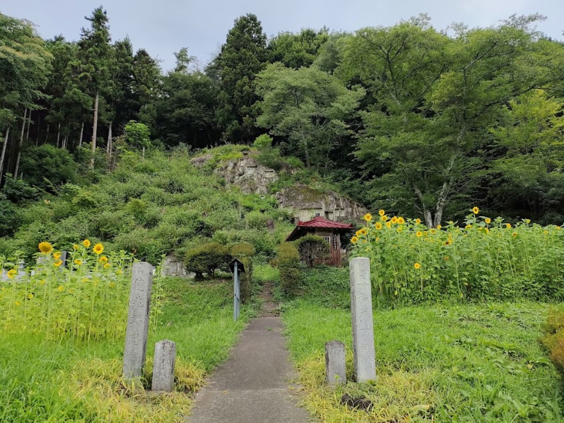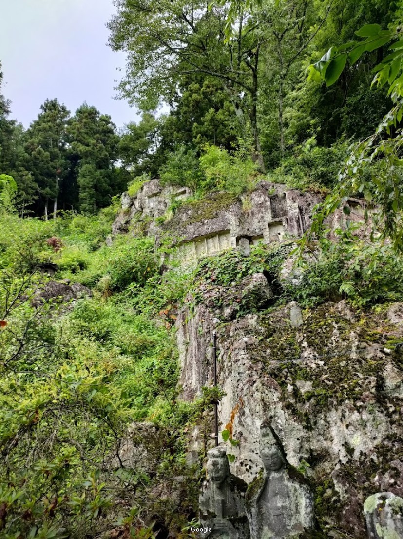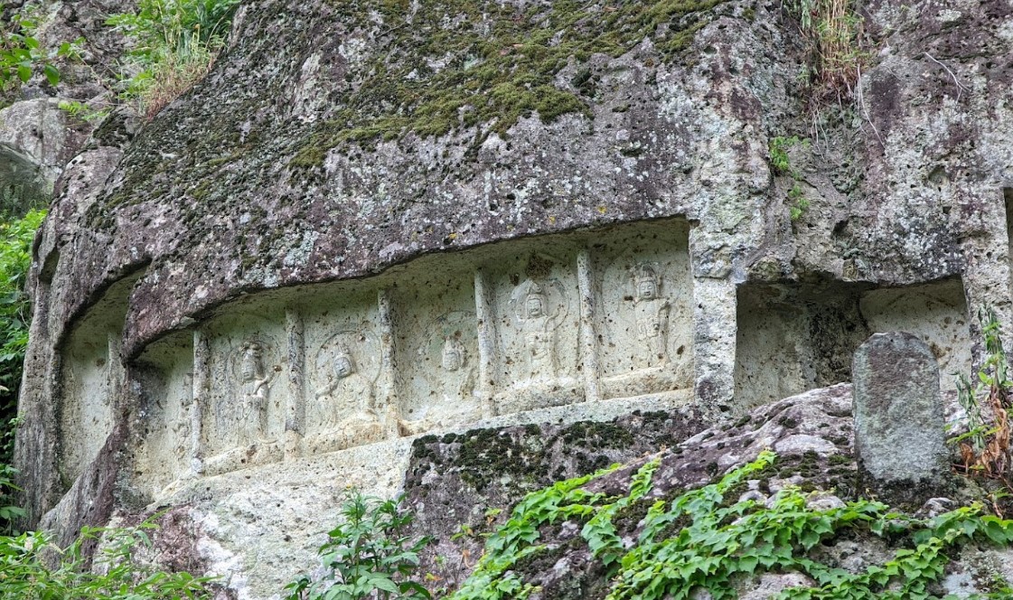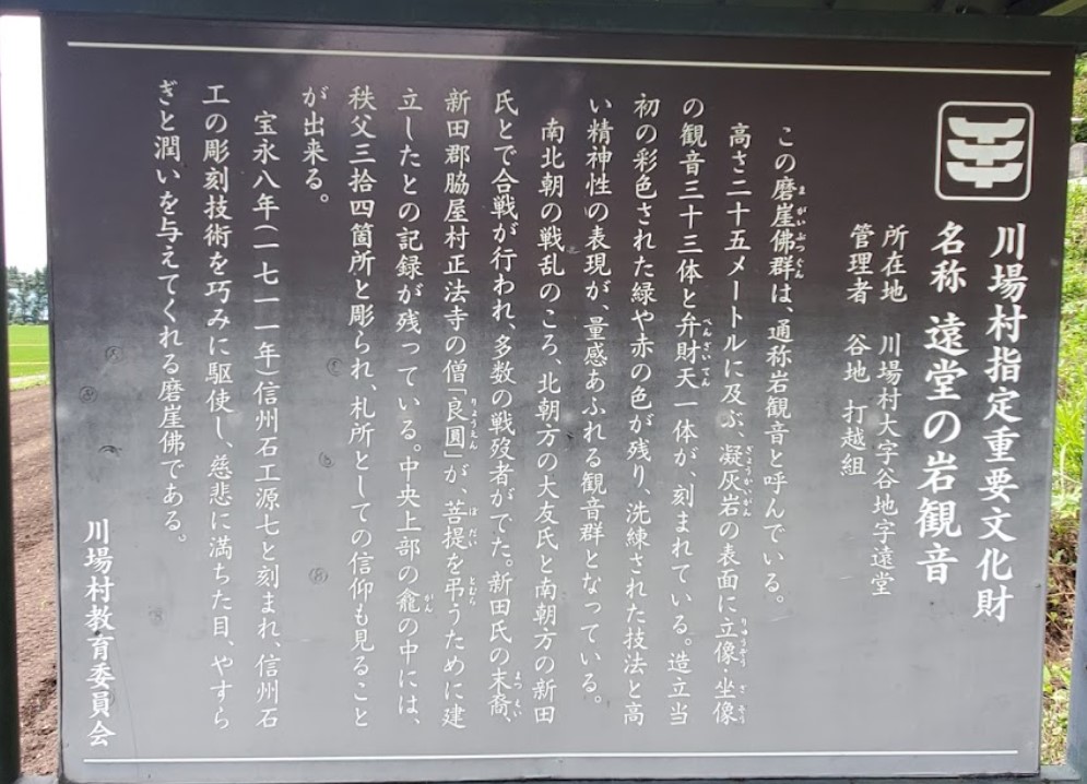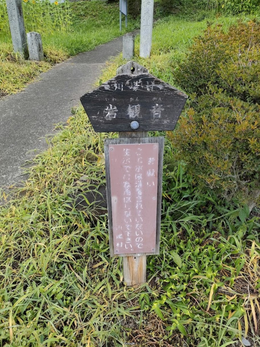 【岩観音菩薩磨崖仏群】 村の重要文化財にも指定されている岩観音は、村の安泰と発展を願い彫られたもので、高さ25mほどの岩に33体の観音像と1体の弁財天像が宝永八年(1711年)に刻まれている。 駐車場が数台あり、隣接してトイレと整備された岩観音の湧水が設けられている。 近くの立て看板には、生水では飲まないように注意書きがされてある。 |