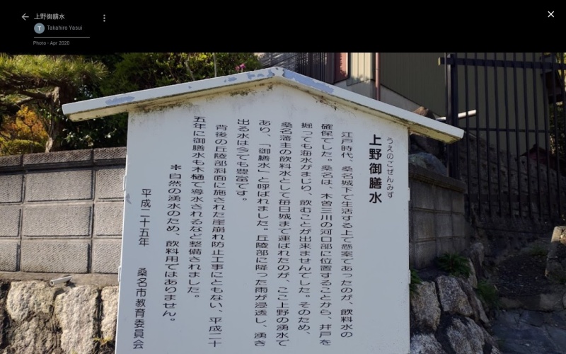 江戸時代には桑名城の城主の飲料水として、毎日城まで運ばれた。 現在でも清冷な湧水が流れ出し、付近の人たちに利用されている。 また、湧水の一部は農業用水や防火用水として溜池に貯えられている。 |