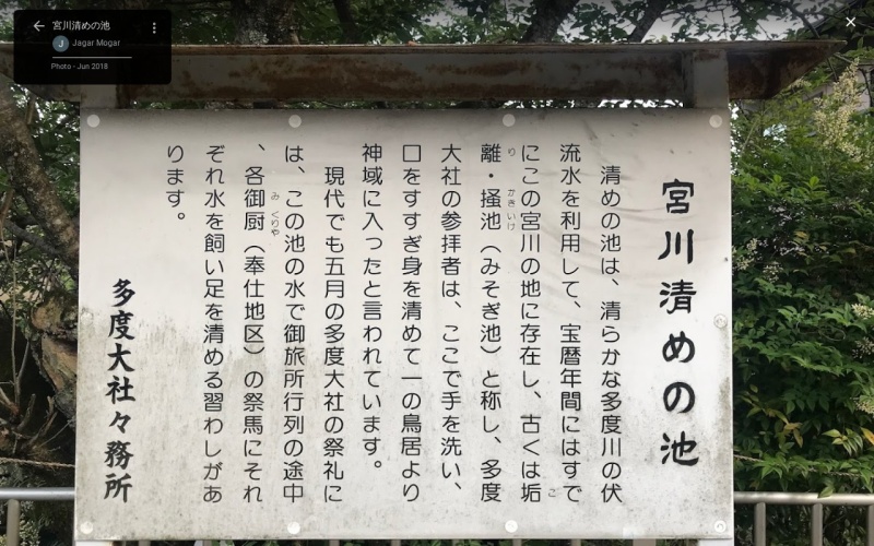 南北朝時代の暦応年間(西暦1338~1341年)より始まったとされる多度大社の神賑行事の一つ、上げ馬神事の際に、神社に入る馬の足をこの池の水で洗い、身を清めるために現在も使われている。