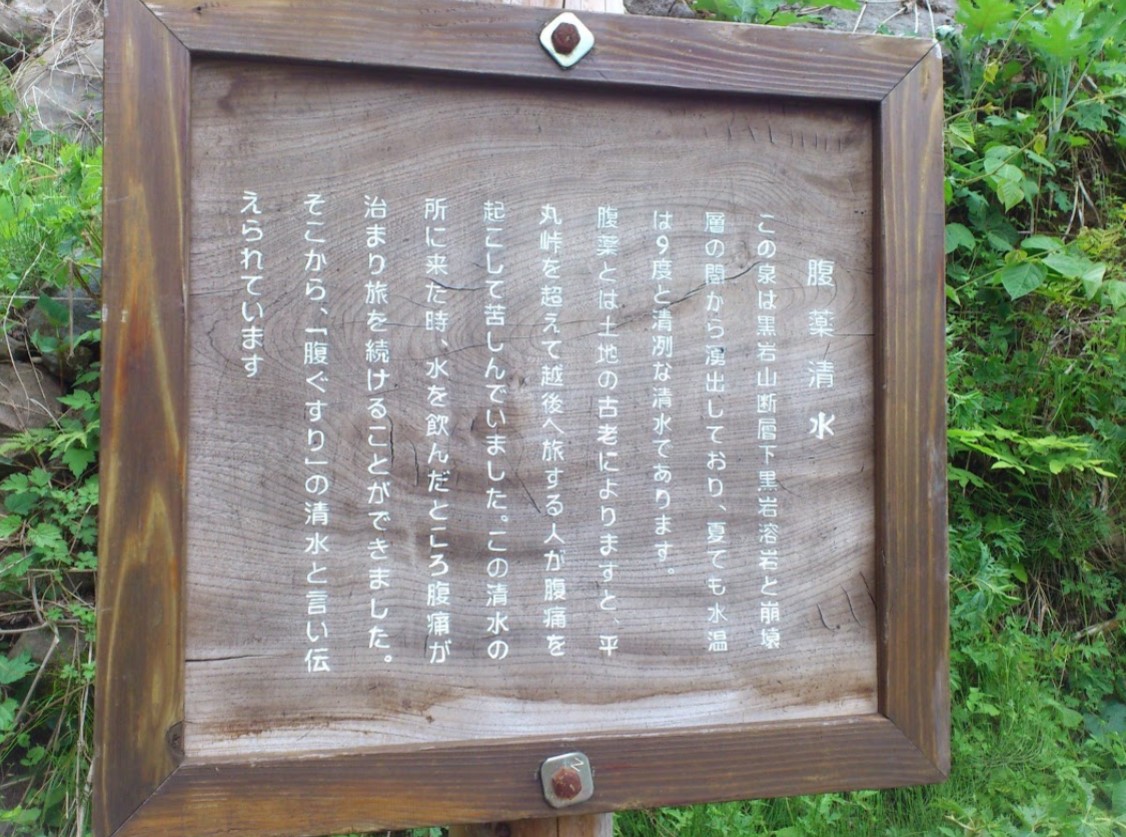 [言い伝え・概要] かつて、この地方と交易が盛んに行われていた越後に通じる平丸峠沿いにあったため、峠を行き交う旅人や農作業をする人の飲料水としても利用されており、当時の人々の腹痛を治したと言い伝えられていることから、腹薬清水と呼ばれています。