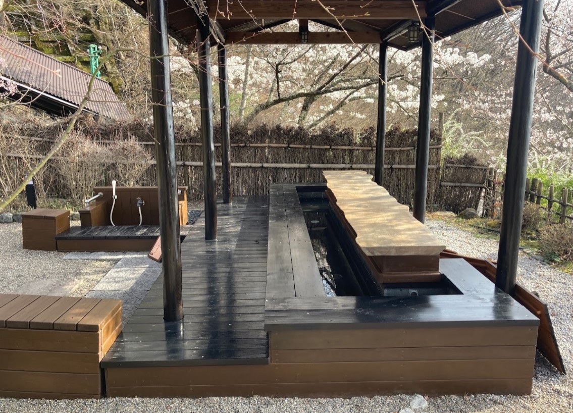 足湯に浸かりながら山上から見下ろす黒川地区の里山景観が四季折々の美しい姿で皆さまを癒しへと導きます。 足湯に入る前に手前のかかり湯(シャワー)で洗ってから入ってください。 ※2023年12月3日限りで妙見の森(妙見の森ケーブル・妙見の森リフト・妙見の森バーベキューテラスを含む)営業終了予定