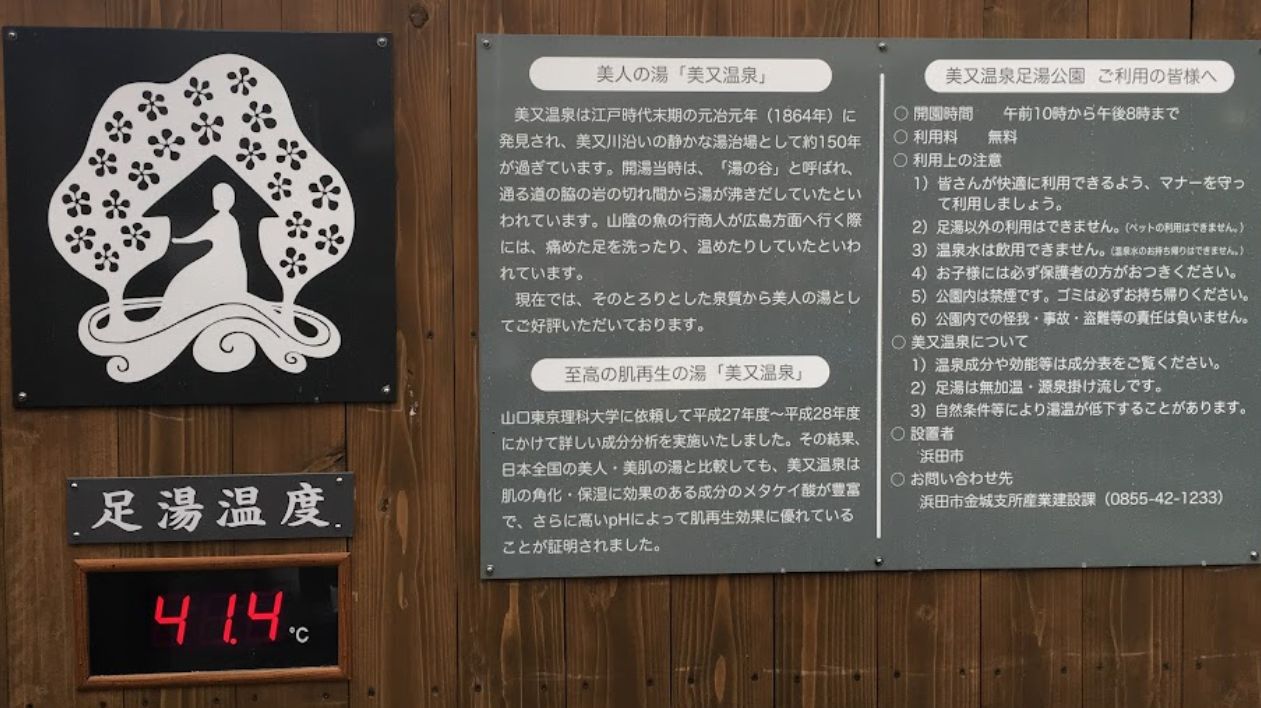 【美又温泉足湯】(島根県の水場)浜田市金城町追原 江戸末期から知られる優れた美肌の湯 川沿いにある東屋の無料足湯 [名称] 美又温泉足湯 [場所] 島根県浜田市金城町追原30 [言い伝え・概要] 江戸末期の1864年(元治元年)の発見から湯治場として知られる。 山陰の行商人が広島方面に行く際に、足労を癒すために利用されたという。 とろりとした泉質で、肌の角化・保湿に効果があるメタケイ酸を豊富に含み、高いpHで肌再生効果があり、全国でも優れた「美人の湯」となっている。 利用時間 午前10時~午後8時 利用料 無料 [保全活動] [Google クチコミ] こちら お気に入りに追加※自然の湧水は煮沸して飲用されるとより安全です。※水辺は水難や危険生物に十分気を付けてください。 Click to share on X (新しいウィンドウで開きます) X このエントリーをLINEで送る (新しいウィンドウで開きます) LINEに送る Facebook で共有するにはクリックしてください (新しいウィンドウで開きます) Facebook このエントリーをはてなブックマークに追加 (新しいウィンドウで開きます) はてなブックマーク (効能別)美肌に効く | (場所)足湯 島根県 | 中国 | 浜田市 投稿日: 2023年11月27日2023年11月27日 投稿者: Sumai事務局