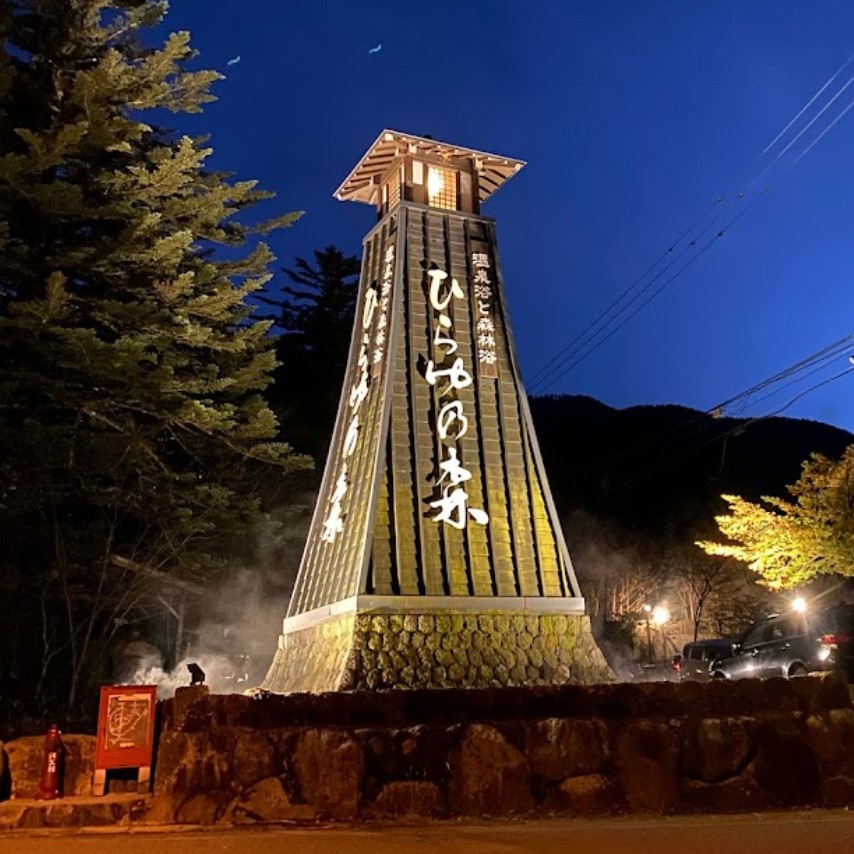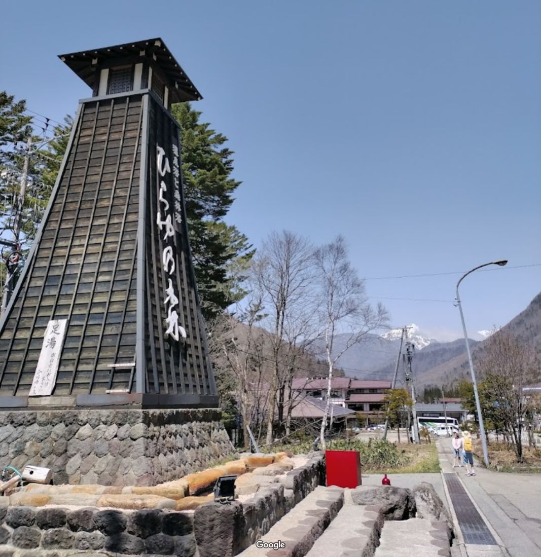 【ひらゆの森 足湯灯台】(岐阜県の水場)高山市奥飛騨温泉郷平湯 奥飛騨最大規模の大露天風呂がある温泉の入り口にある 和風灯台の下の無料足湯