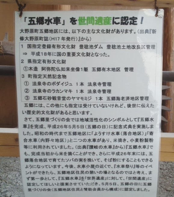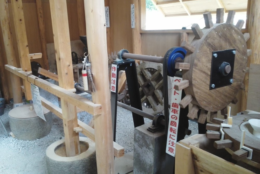 水車はその動力を使って、小屋の中で米を搗(つ)くことや、ソバの実を挽いてそば粉にすることもできるようになっている。 「世界遺産」にならって「世間遺産」として五郷里づくりの会に認定されている。 |