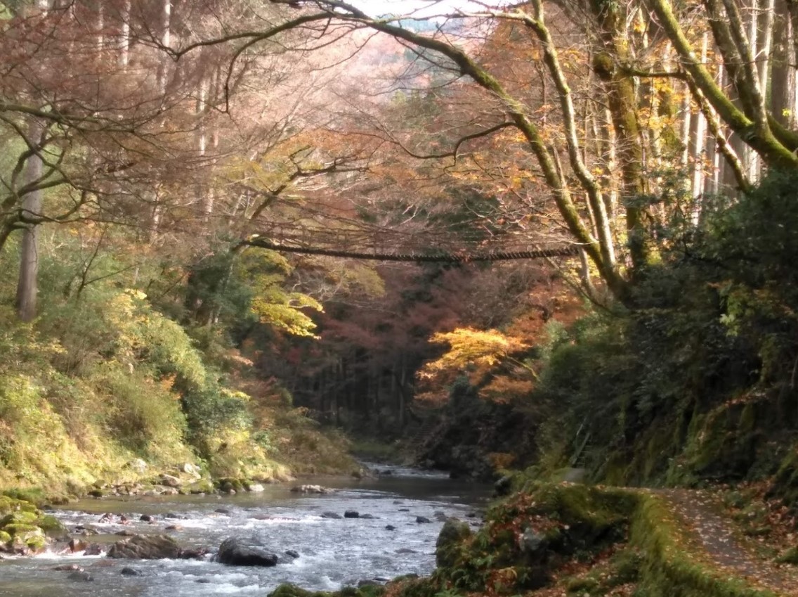 かずら橋下の足羽川渓谷沿いは約4kmの自然遊歩道になっていて、魚の泳ぐ姿が見られ、鳥のさえずりも聞こえてくる。 |
