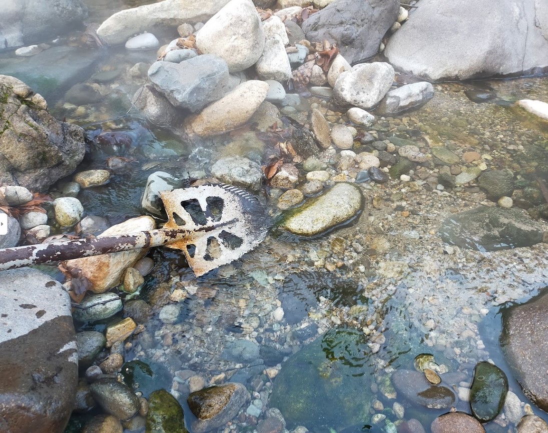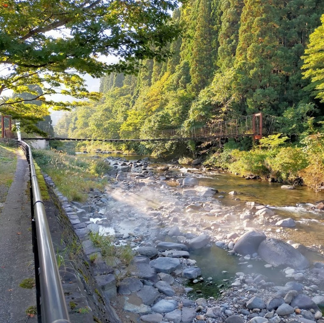 【川原の湯っこ】(秋田県の水辺)湯沢市秋ノ宮湯ノ岱 川の中の至る所が緑の温泉 スコップで掘って入る・ほかほかオリジナル無料足湯