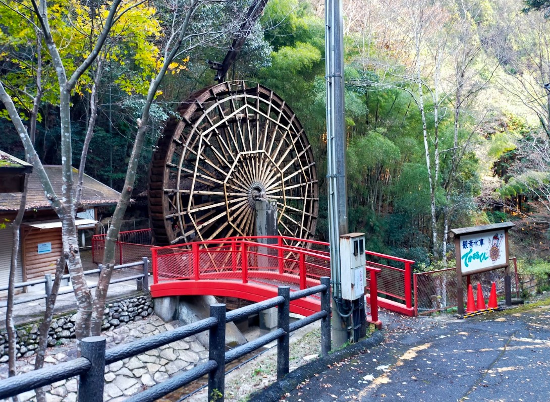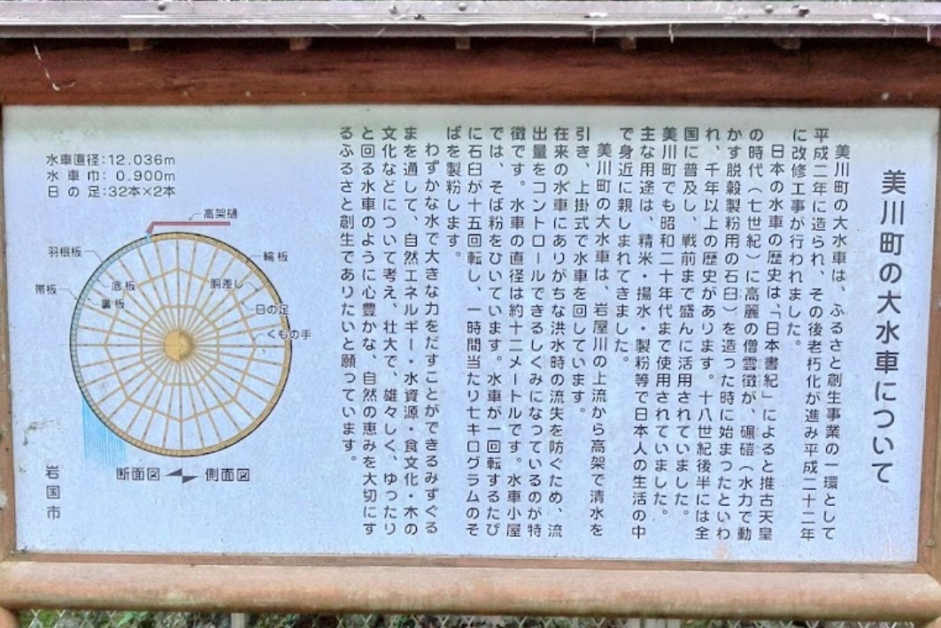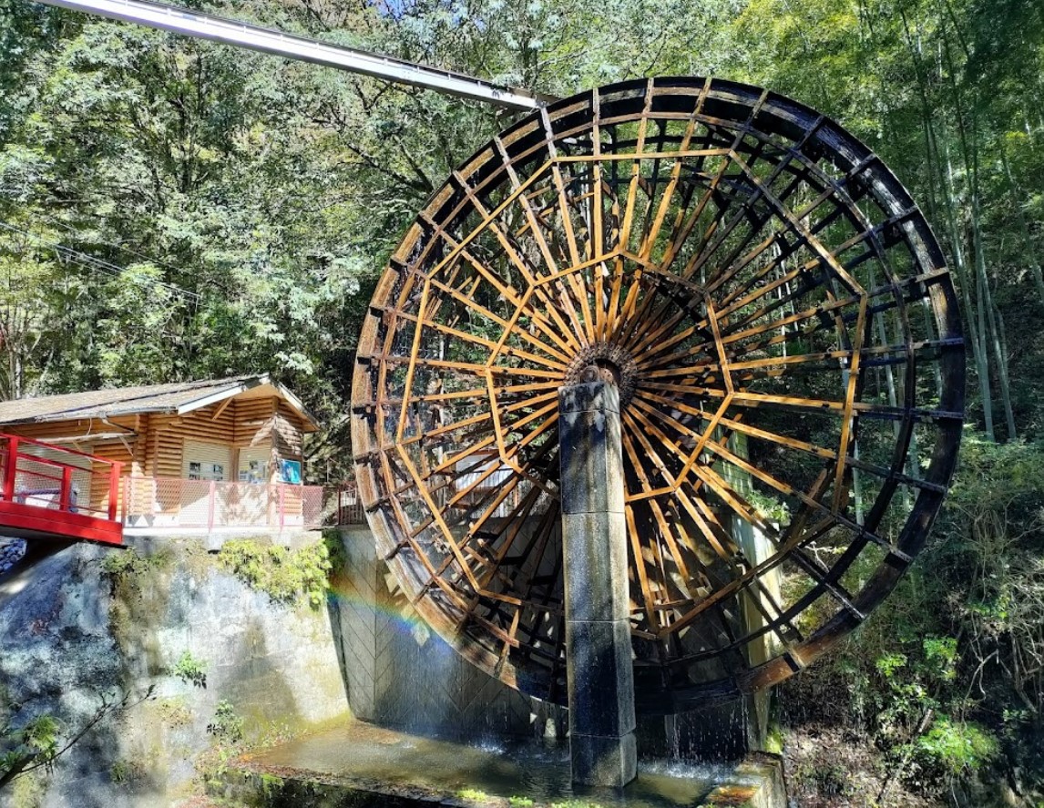 ふるさと創生事業で平成2年に造られ、平成22年に改修された水車で、直径12mの大きさは完成当時日本一大きい木造水車と呼ばれた。 岩屋川の上流から高架で運んだ清水を水車の上から落として回転させる「上掛式」は、わずかな水で大きな力を出すことができ、洪水時に流出量をコントロールして水車の流出を防いでいる。 |
