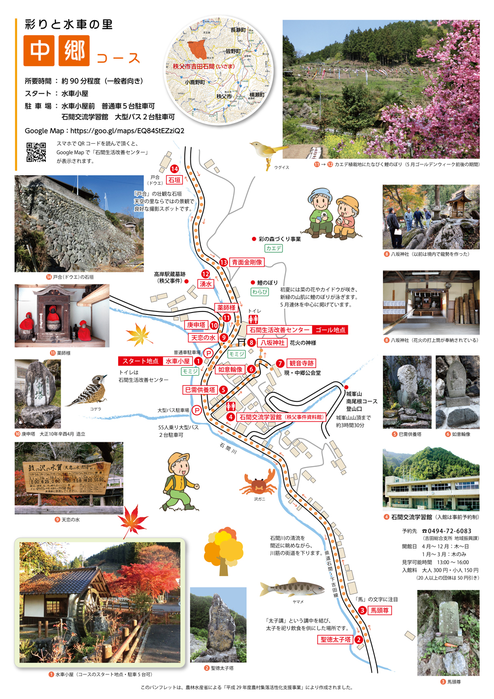 そばには「中郷の水車小屋」、少し歩くと聖徳太子塔、薬師様、庚申塔などがあり、歴史探訪を楽しむことができる。