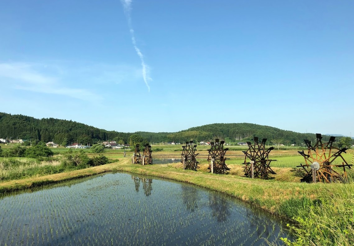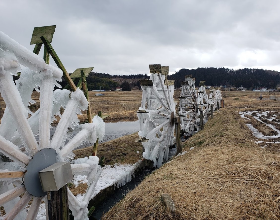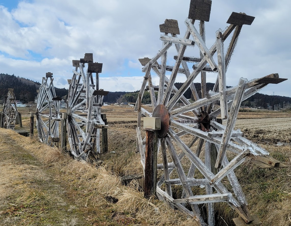 【長崎の水車】(宮城県の水場)栗原市一迫中島 季節毎に趣があり 冬場には氷を纏った姿が美しい 田園地帯の六連水車群