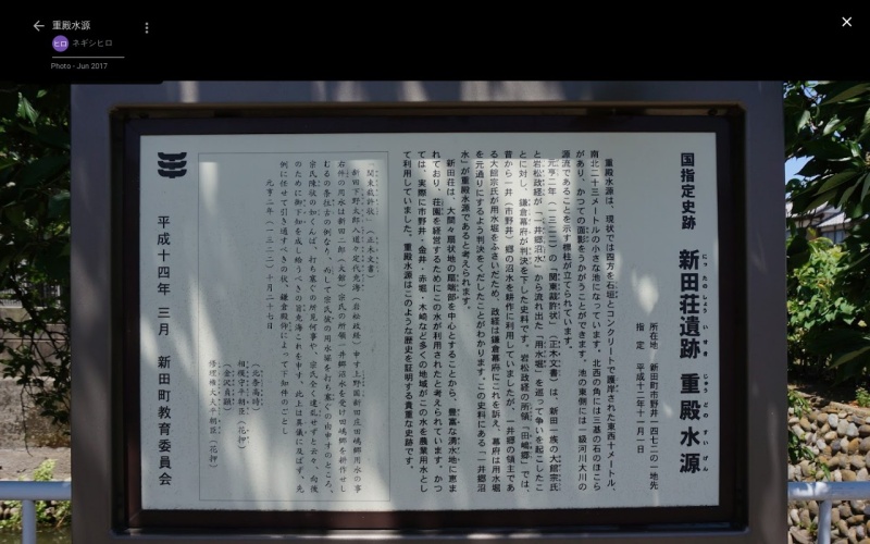 【重殿】(群馬県の湧水)太田市新田市野井町 中世の荘園経営に利用された 新田荘遺跡の農業用水池 [湧水の名称] 重殿(じゅうどの) [場所] 群馬県太田市新田市野井町 [言い伝え・概要] 国指定「新田の荘遺跡」。中世鎌倉時代の豪族、大館氏と岩松氏がこの湧水を巡って論争をおこした文献が残る。一級河川大川の水源地となっている。 [保全活動] [Google クチコミ] こちら 出典 環境省ホームページ お気に入りに追加※自然の湧水は煮沸して飲用されるとより安全です。※水辺は水難や危険生物に十分気を付けてください。 Click to share on X (新しいウィンドウで開きます) X このエントリーをLINEで送る (新しいウィンドウで開きます) LINEに送る Facebook で共有するにはクリックしてください (新しいウィンドウで開きます) Facebook このエントリーをはてなブックマークに追加 (新しいウィンドウで開きます) はてなブックマーク (種類)農業用水 関東 | 群馬県 | 太田市 投稿日: 2021年3月18日2023年6月20日 投稿者: Sumai事務局