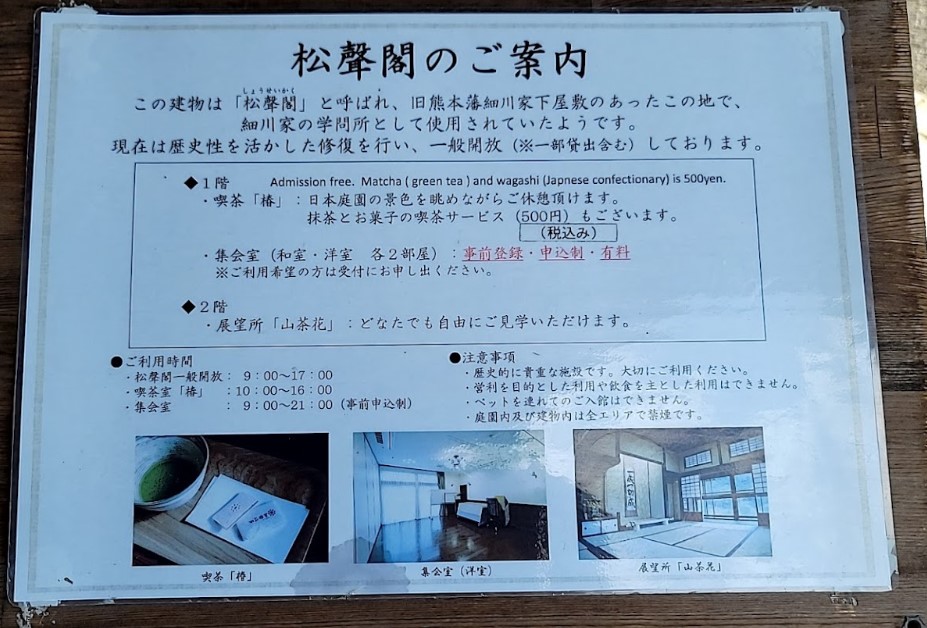 松聲閣(しょうせいかく)は、旧熊本藩細川家下屋敷のあったこの地で、細川家の学問所として使用されていたようで、一時期は細川家の住まいとして使用されていました。現在の建物は、歴史性を生かして保存・修復を行うとともに、耐震性を確保し、平成28年1月にリニューアルオープンしました。