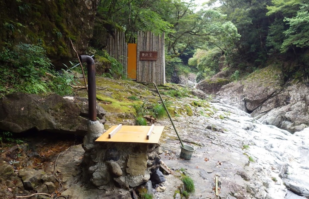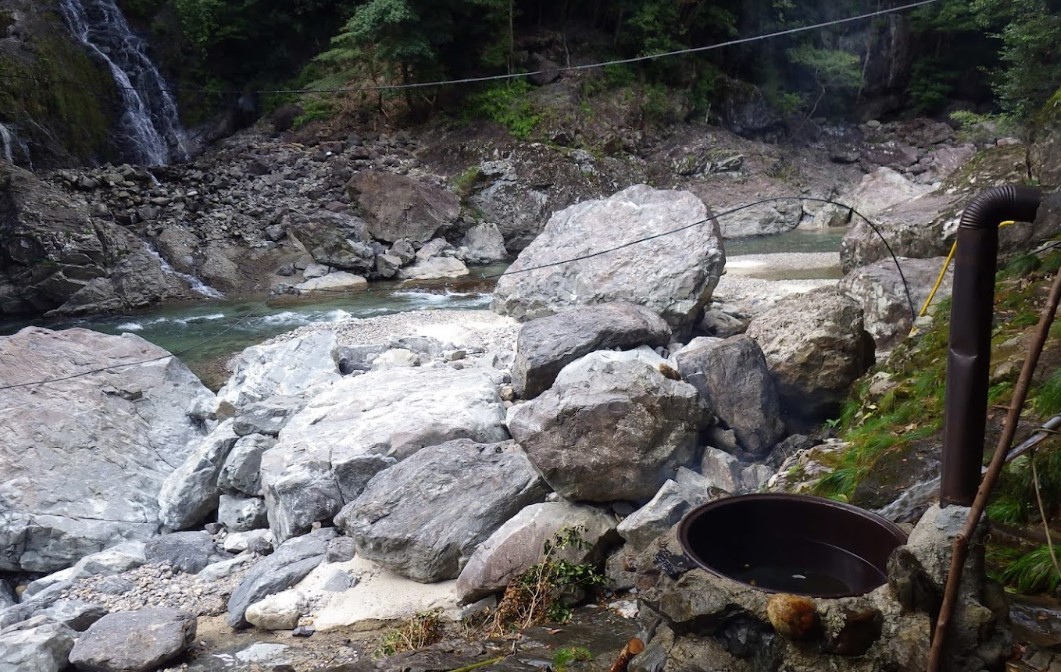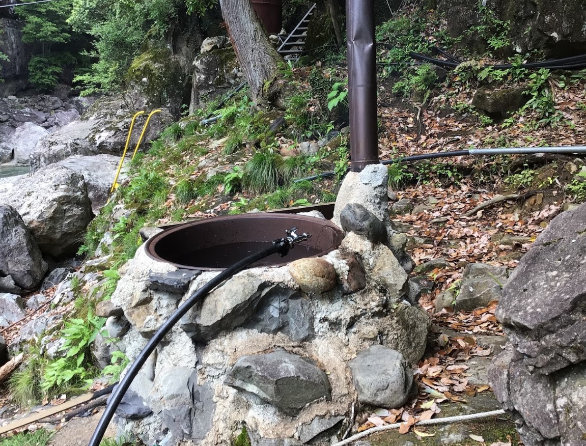 車は離合スペースの路肩に駐車して、狭い林道を降りていく。 辺りの景色を眺めながら入浴でき、解放感を感じることが出来る。 川の対岸から引かれている温泉は、長いホースを通って給水され、温度が低いので、暑い季節でなければ薪を使うのが良いという。 近くに更衣室もある。 夜間や女性のみでの立ち入りは危険との看板が出ているので、男女での入浴を推奨。 |