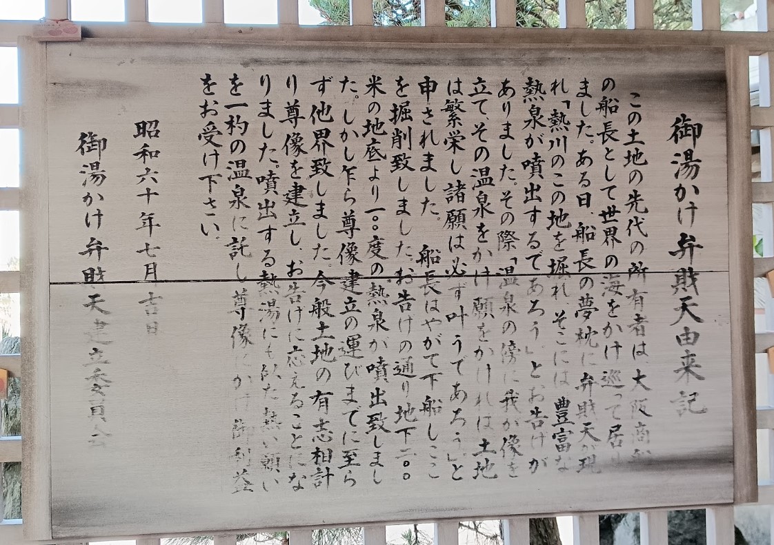 | [言い伝え・概要] | 熱川温泉にある、先の土地所有者だった大阪商船の船長さんの夢枕に七福神の弁財天が現れて、お告げにより湧き出たとされる温泉。
