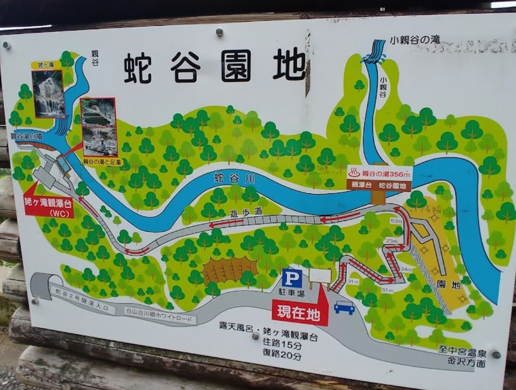 滝は落差111mの岩肌を斜めに広がりながら伝い落ちている分岐瀑。 露天風呂はホワイトロード通行可能期間中にご利用可能で、足湯もある。入浴の際は、水着を着用のこと。 料金 無料 時間 6~8月/7:00~18時、9~11月/8:00~17:00(ホワイトロードの供用時間) 駐車場 有(白山白川郷ホワイトロード内) ※蛇谷園地駐車場から徒歩で約15分。急な階段あり。 ※閉門時刻の都合上、8月末までは17時以降、9~11月の間は16時以降、蛇谷園地駐車場から親谷の湯へ向かわないよう注意が必要。 |
