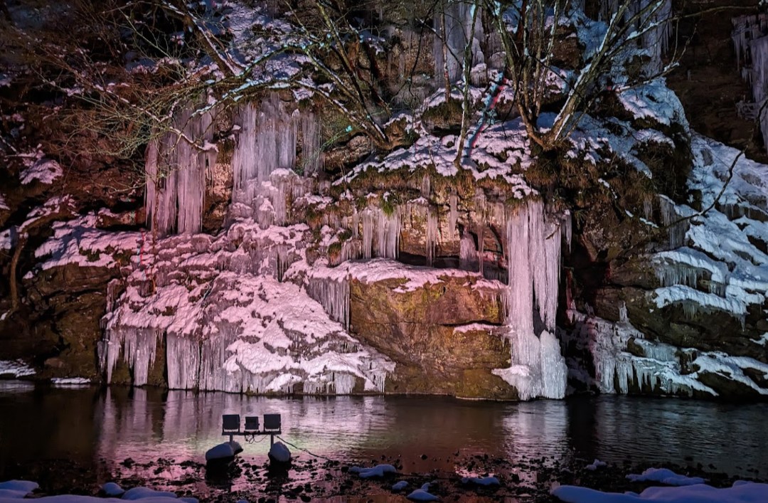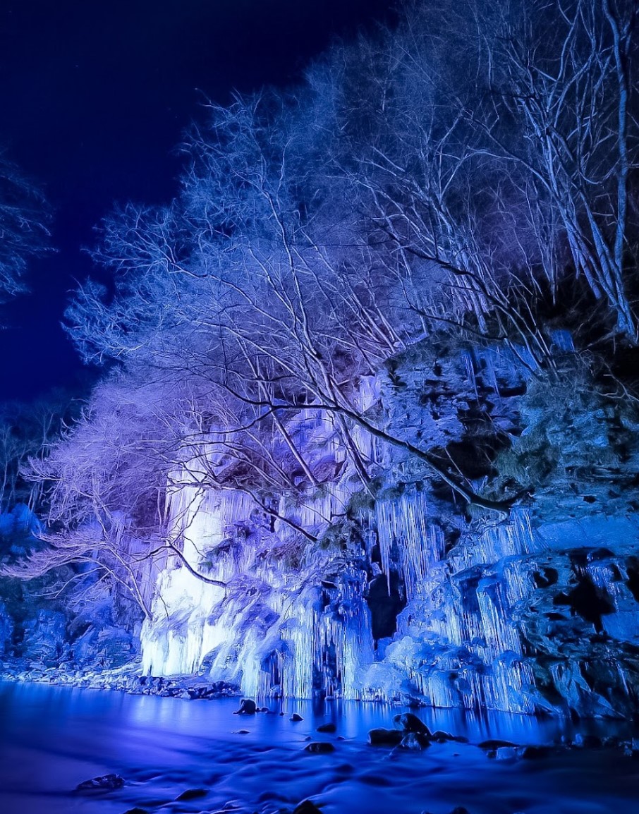 岩肌から染み出た湧水が次第に凍って次第に氷柱が成長し、天然の氷柱は高さ8m・幅30m、人工の氷柱は高さ25m・幅55mの大きさになり、例年、神秘的で美しい氷の芸術としてのたたずまいが出来上がっている。 1月中旬から2月中旬頃が見頃で、夜はライトアップされる。 駐車場 普通車 500円、 バイク 200円、 マイクロバス 1,000円、 観光バス 2,000円(専用駐車場に駐車) 入場料金 大人一人 200円(中学生以上) 子供一人100円(小学生以上)、小学生未満無料 営業時間 8:30 ~ 17:00 (ライトアップ時は平日19:00,土日祝祭日は20:00まで) |