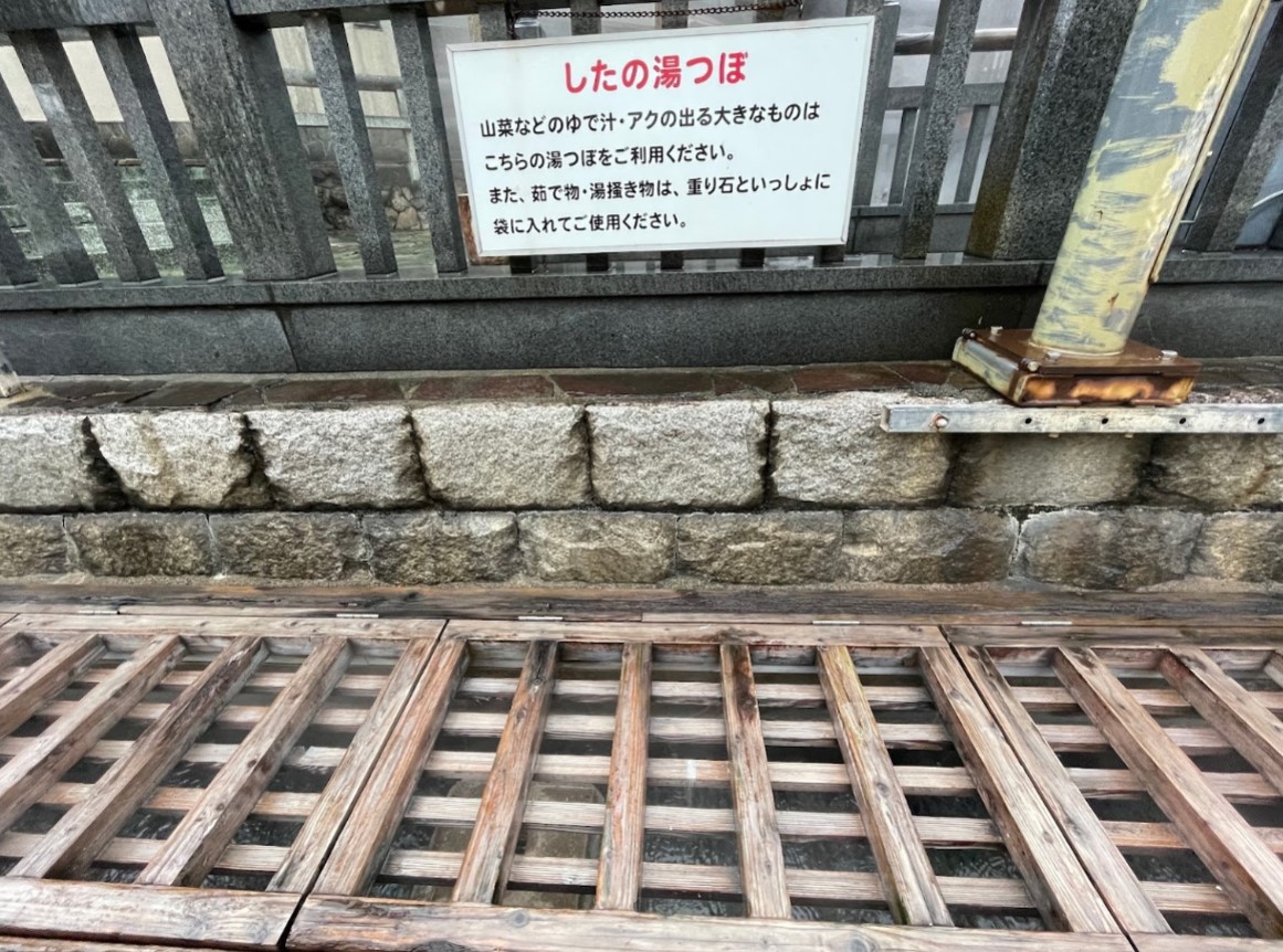 源泉温度は98度で、春来川(はるきがわ)のほとりに、湯村温泉の名物「荒湯たまご」が作れる「湯つぼ」がある。 「なかの湯つぼ」約15分で卵が茹で上がる。 「したの湯つぼ」卵以外の野菜などを茹でる場所。 そばには川の流れが見える位置に「ふれあいの湯」と呼ばれる足湯が設置され、茹で上がるまでの時間はここでのんびりすることができる。 足湯利用時間 7:00頃~21:00頃 |