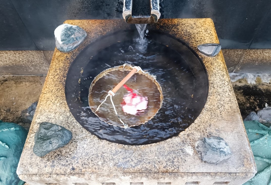 備え付けのカゴにたまごを入れ源泉にひたせば、ほんのり塩味のする温泉たまごの出来上がり。
