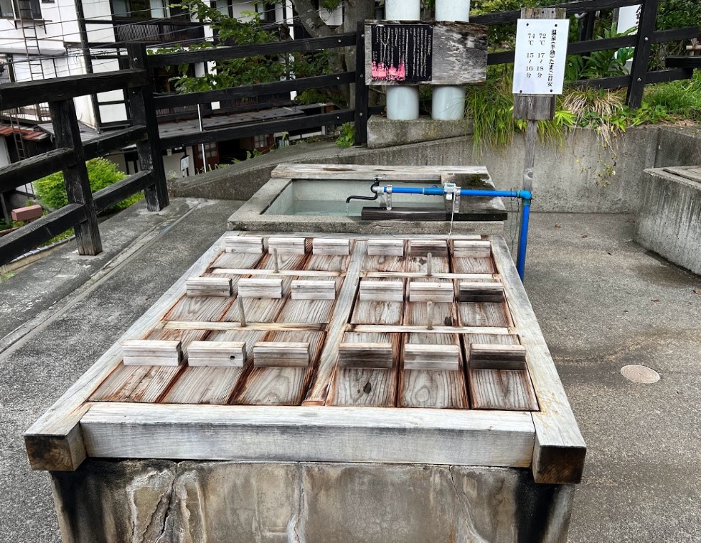 高台にあるこの場所は見晴らしが良く、足湯でのんびり暖まりながら、温泉たまごをつくれる広場になっている。 70℃くらいの温度で加熱すると、卵白は固まらず、卵黄だけが固まり、卵黄よりも卵白が柔らかい温泉たまごになります。 卵とネット・かごは持参。 隣に温泉たまごを冷やす水槽あり。