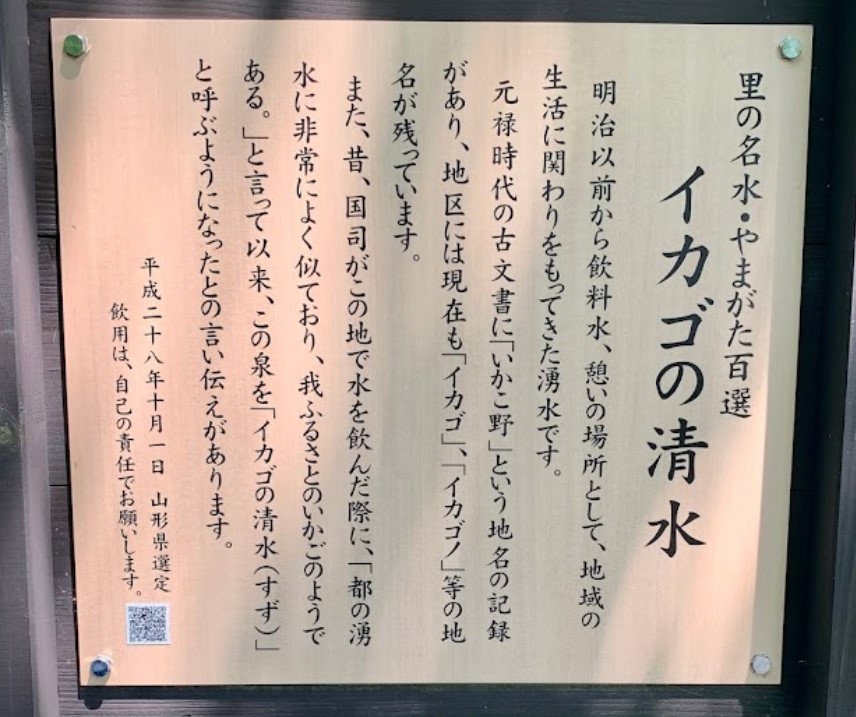 JR奥羽本線北大石田駅から道なりに3㎞ほど西にある。 北西に広がる低い山と丘陵の伏流水と考えられる。 付近には縄文から中世までの遺跡があり、「イカゴすず」は大石田町の登録記念物になっている。 この水の記録はないが、昔からの文化がある場所である。 季節によって湧出量は変化するが、枯れたことはないという。 |