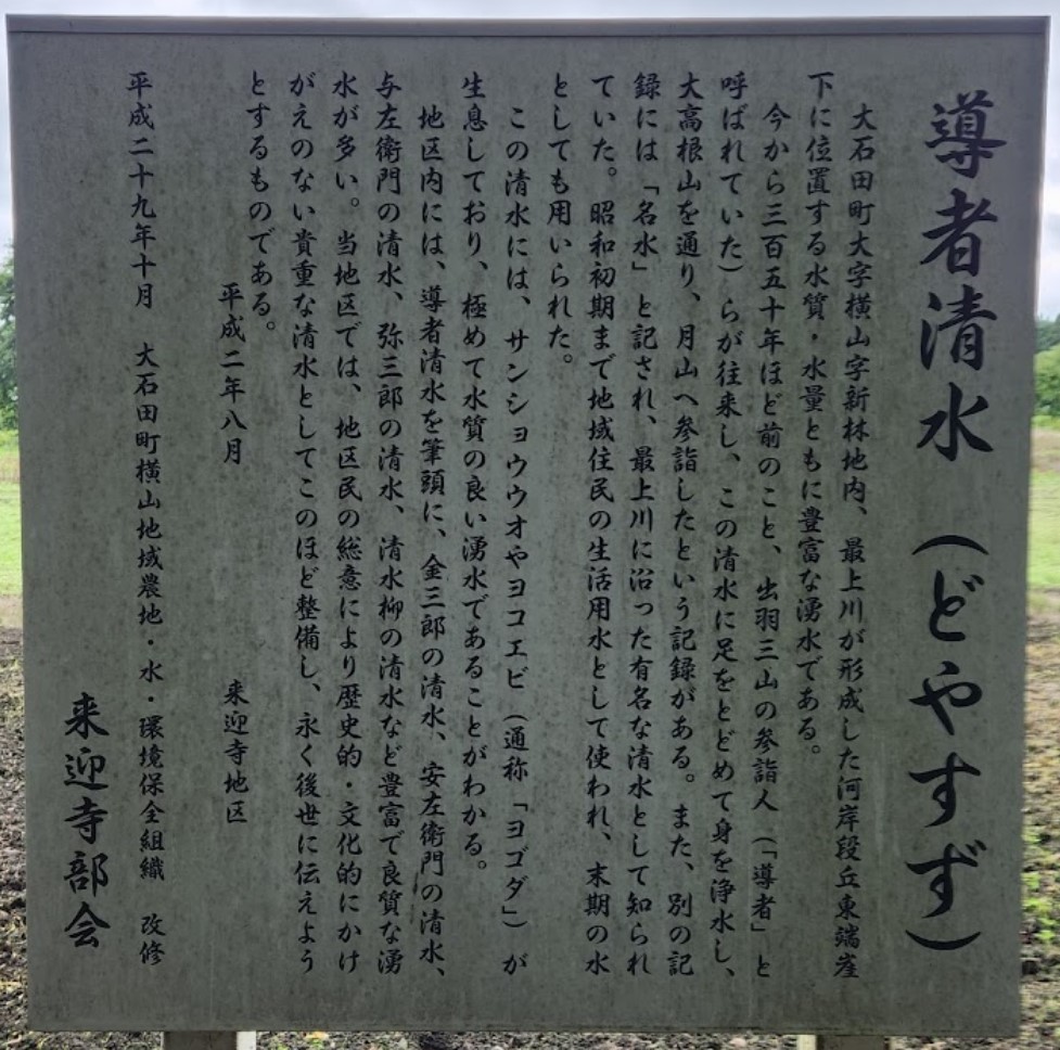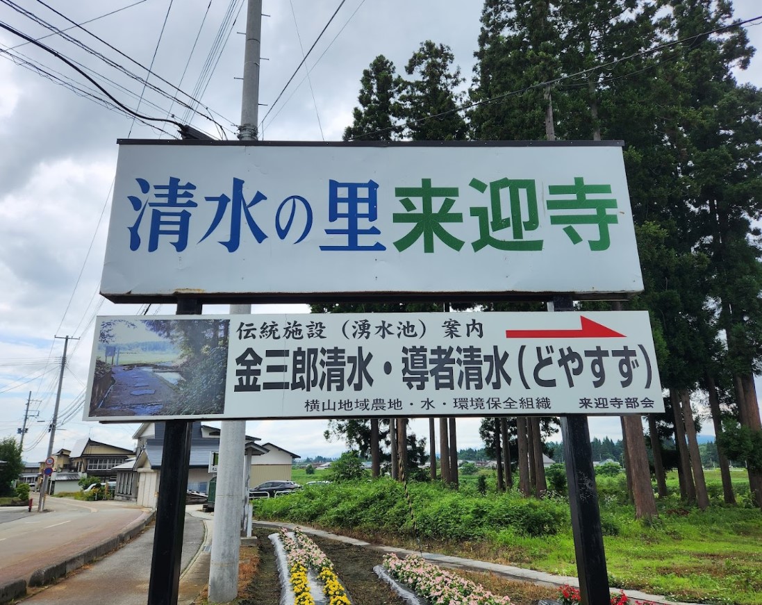 この湧水は、大石田町の登録文化財。この名水のある来迎寺地区は、そば街道沿いにあり、一帯にそば畑が広がっている、そばの在来種「来迎寺そば」の由来ともなっている。