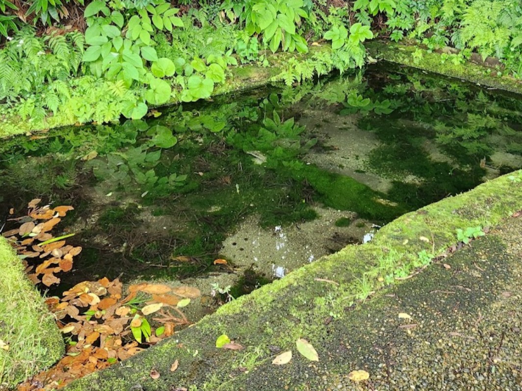 来迎寺地区内、最上川の河岸段丘に、木立に囲まれた石造りの水場があり、その底から水が湧き出ている。