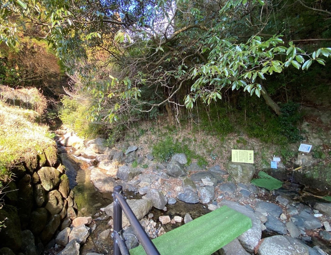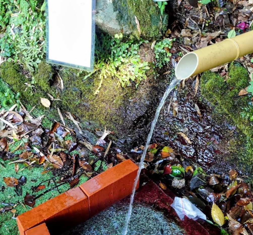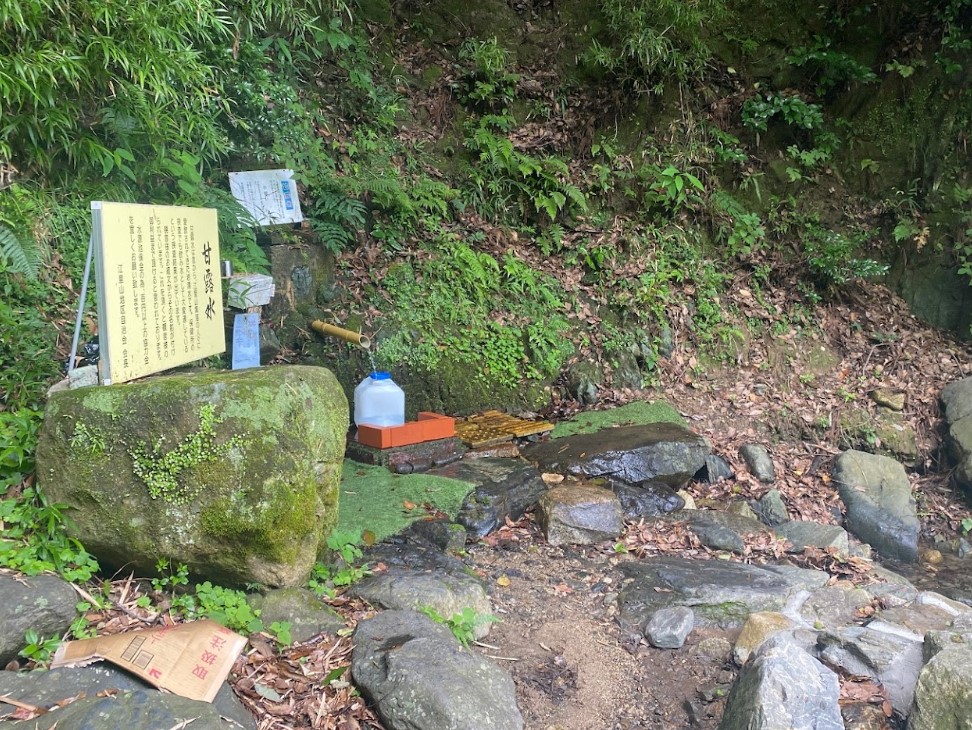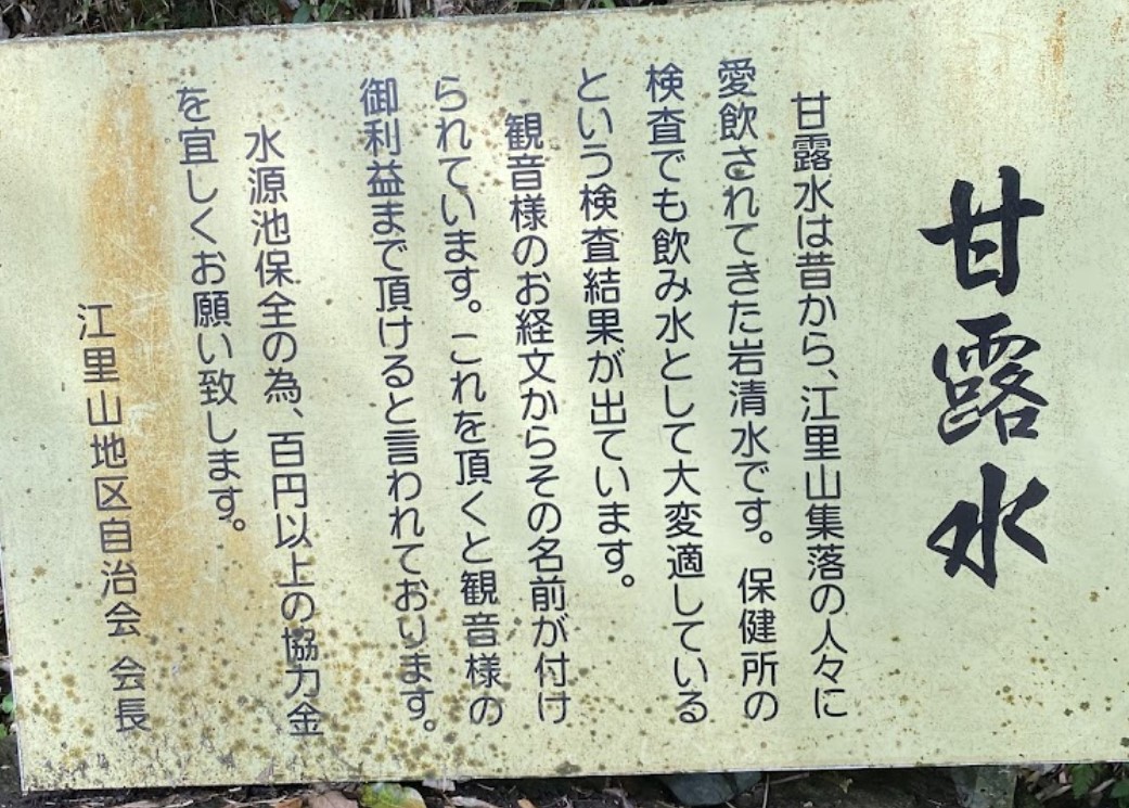 岩と岩の間から竹筒を通して流れている、江里山地区の岩清水。 江里山観音は安産祈願のご利益を願って訪れる人々が多く、「江里山の甘露水」は、観音様の経文からその名前が付けられている。