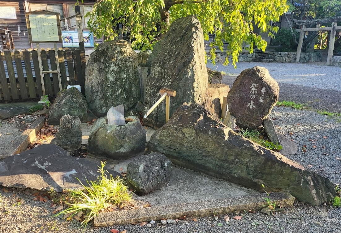 その昔、川の上流に、日に映えて紫に輝く石があったという。 土地の人々は、自然の真水の恩恵に浴し「紫の水」と呼ぶようになった。 まさに「宮水の源泉」だと伝えられている。 また地元では、お酒醸造の貴重な清水として利用されている。 (掲示板より) |