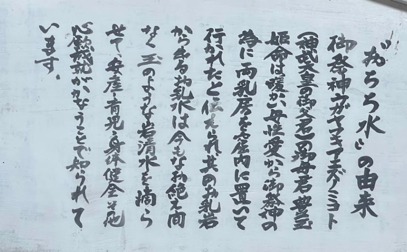 ご主祭神は、豊玉姫がくっつけて行かれたお乳岩から滴り落ちる水でつくった飴を母乳がわりに、お育ちになったといわれている。