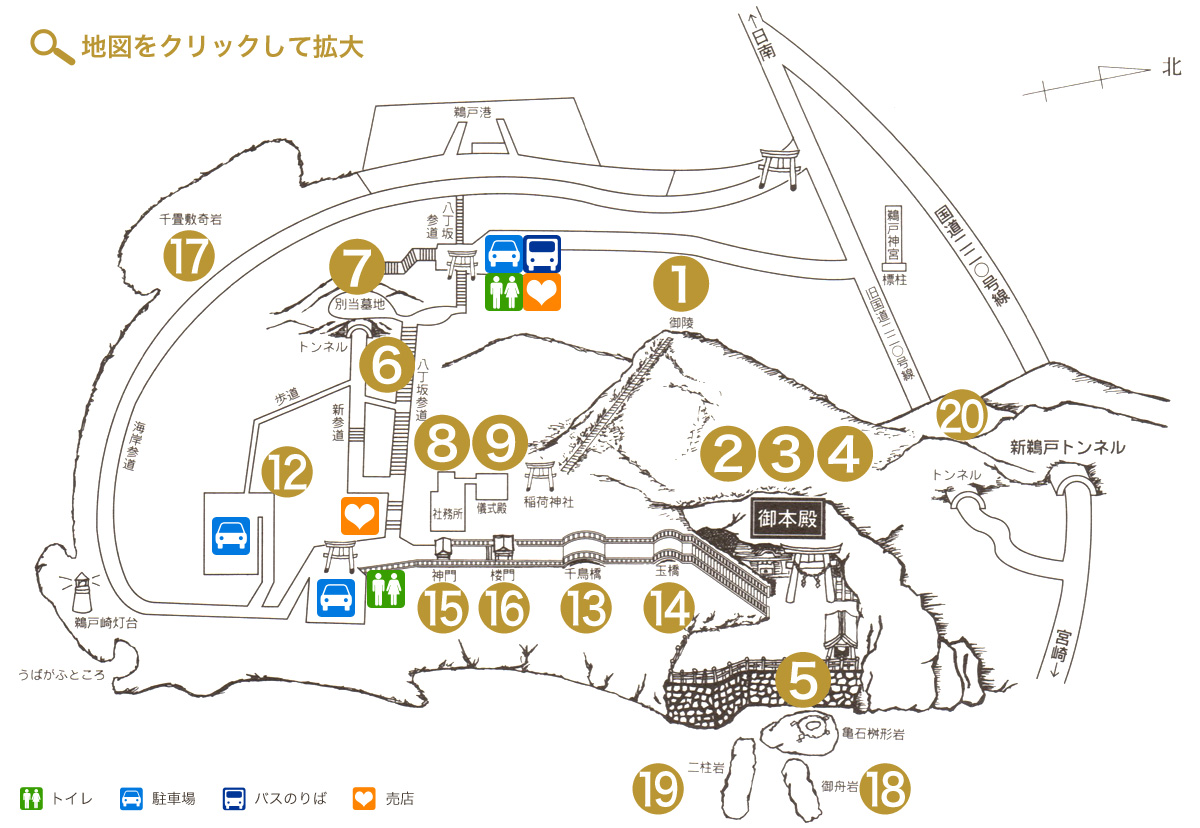 母君の豊玉姫が御子の育児のため、両乳房をご神窟にくっつけて行かれたと伝える「おちちいわ」は、いまもなお絶え間なく玉のような岩しみずを滴らせて、安産・育児を願う人々の信仰の拠り所となっている。