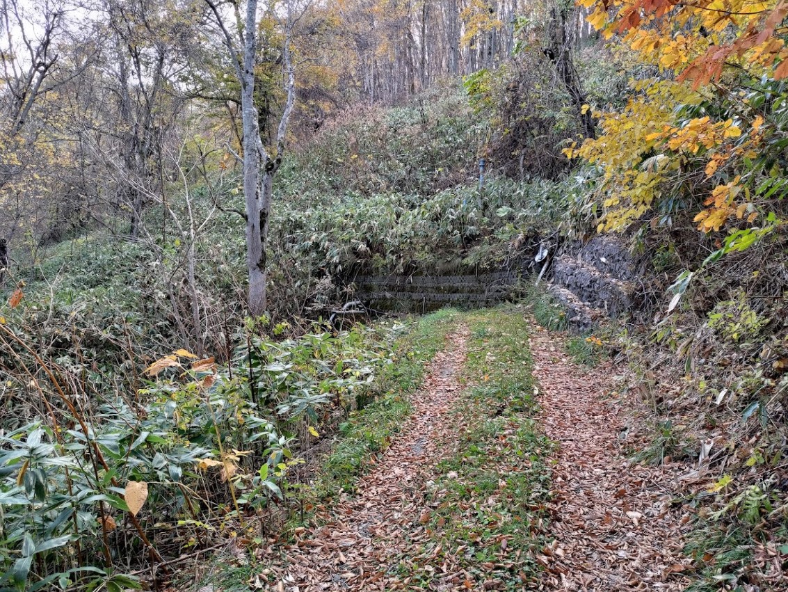 湧水手前の道は車が離合や旋回できそうな場所が無く、悪路なので注意が必要。