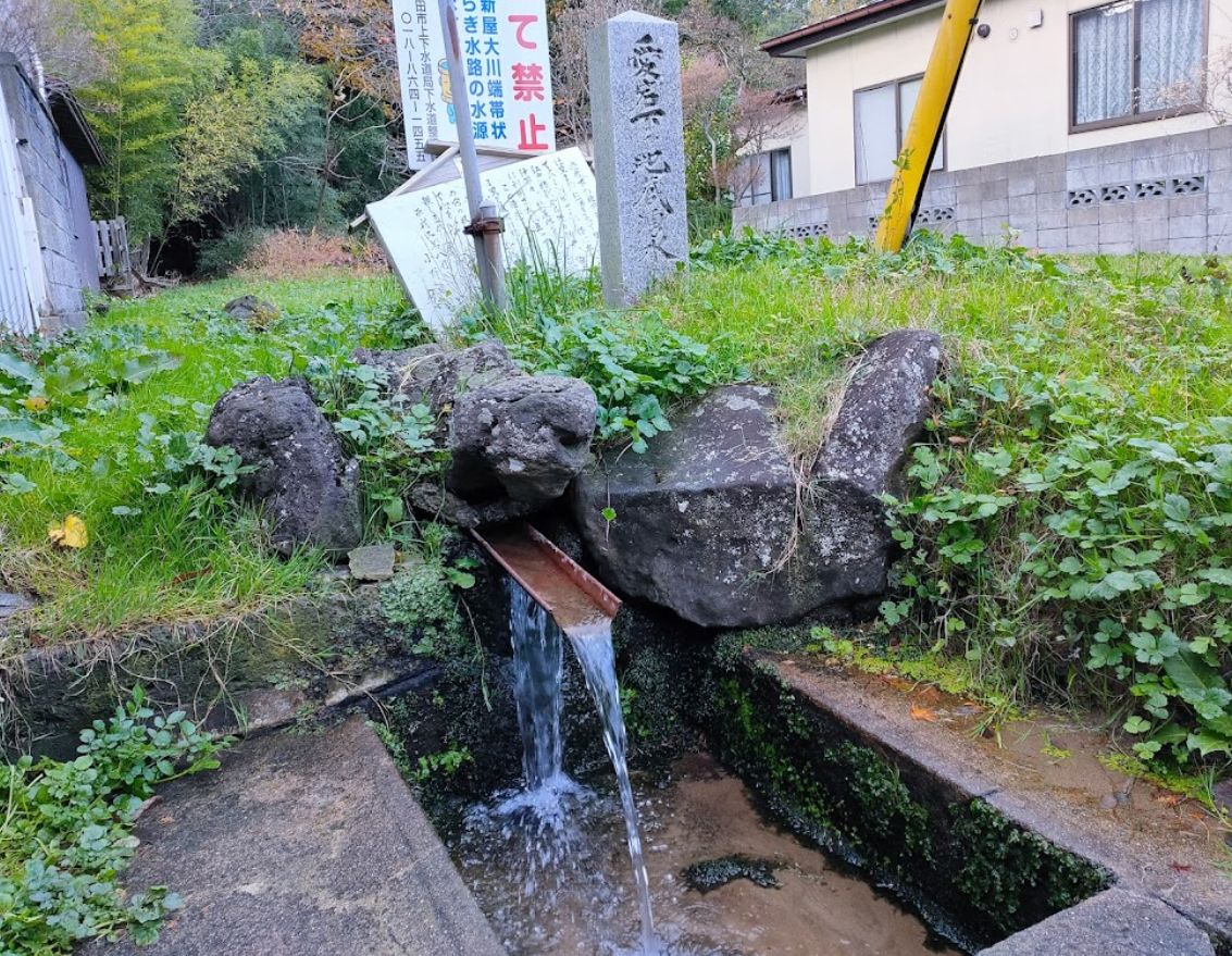 海岸線を南北に走る砂の小高い丘(新屋砂丘)へ降る雨と雪が、地下20mの地下水層へ溜まり、新屋町の随所から湧き水となって流れ出る。