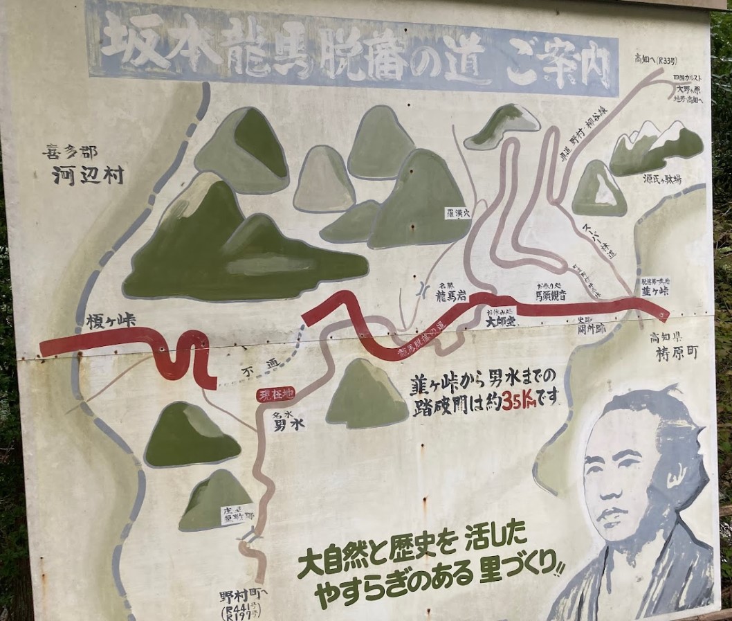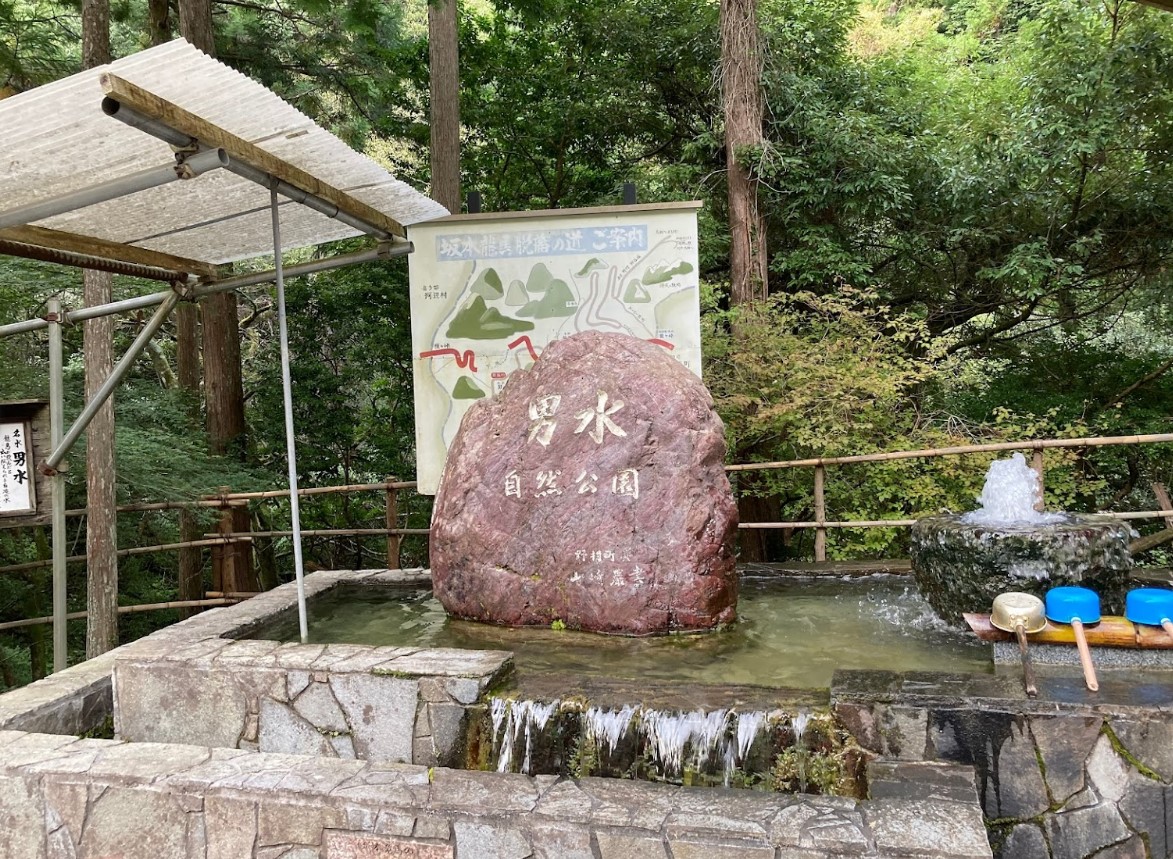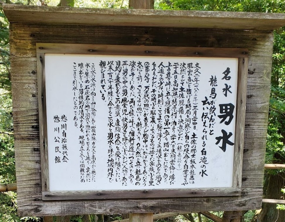 人通りの少ない時間に3.5km程駆け降りてこの地にたどり着き、清水でのどの渇きを潤したとされる。 「名水男水」は、男の中の男、風雲児である坂本龍馬にちなんで名付けられた。 この水は四国山脈カルスト高原を水源とし、石灰岩の地下洞穴を通って湧出する水を立ち入り困難な現地から引水した清水である。 (掲示板要約) |