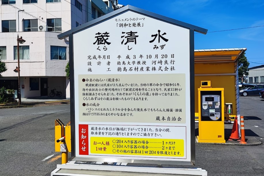 バランスのとれたミネラル分を含んだPH6.8のまろやかな名水。 地下約30mから汲み上げた水をセンサーで自動給水している。 一人一回 20リットルまで 蔵本地区は陸軍連隊が置かれた1908年以降、軍と共に発展し名水にも恵まれ民家にはそれぞれ「くらしの泉」を持っていたが、1939年戦争に伴って立ち退きを命じられることとなった。1991年(平成3年)その復活を願い設置されたのが「蔵清水」で「蔵本の清水」「暮らしの水」という意味が込められている。 |
