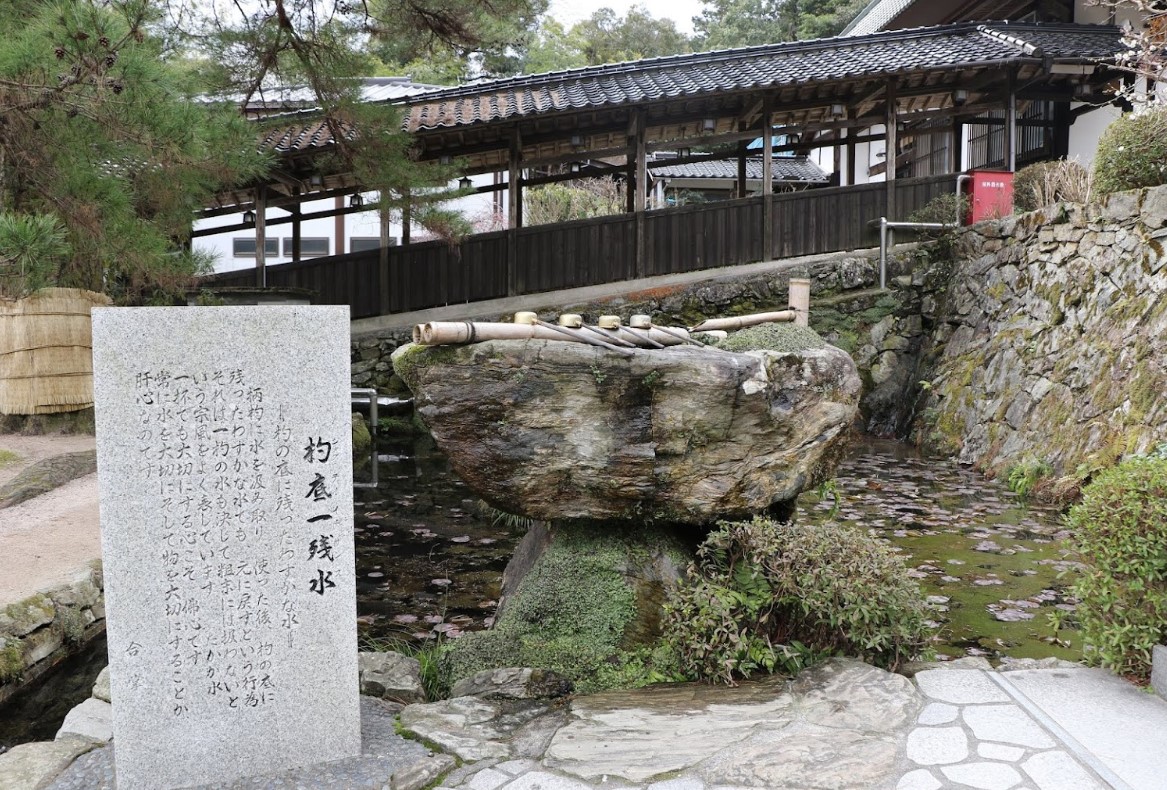 国宝に指定された五重塔(1442年頃建立)や見事な庭園のある曹洞宗の寺院、瑠璃光寺の中にある御手水。本堂へ向かう前に手を清める場所となっている。 =杓の底に底に残ったわずかな水= 柄杓に水を汲み取り、使った後、杓の底に残ったわずかな水でも、元に戻すという行為、それは一杓の水も決して粗末には扱わないという宗風をよく表しています。 たかが水一杯でも大切にする心こそ、佛心です。 常に水を大切にそして物を大切にすることが肝心なのです。 合掌 (石碑より転記) |
