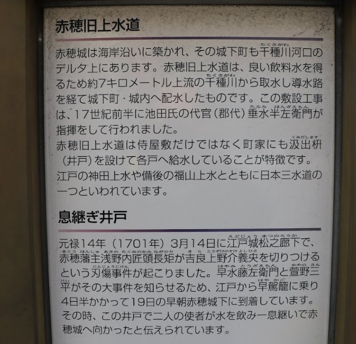 【息継ぎ井戸】兵庫県赤穂市加里屋 赤穂事件発端の危急を知らせる使者が一息ついた 伝説の井戸 [名称] 息継ぎ井戸 [場所] 兵庫県赤穂市加里屋2210 [言い伝え・概要] 早水藤左衛門・萱野三平の両名が、早かごで主君刃傷の凶報をもって江戸より駆けつけた際、この井戸で一息ついて城内の大石内蔵助邸へ入ったといわれています。 [保全活動] [Google クチコミ] こちら 出典 赤穂市 お気に入りに追加※自然の湧水は煮沸して飲用されるとより安全です。※水辺は水難や危険生物に十分気を付けてください。 Click to share on X (新しいウィンドウで開きます) X このエントリーをLINEで送る (新しいウィンドウで開きます) LINEに送る Facebook で共有するにはクリックしてください (新しいウィンドウで開きます) Facebook このエントリーをはてなブックマークに追加 (新しいウィンドウで開きます) はてなブックマーク (場所)井戸 近畿 | 兵庫県 | 赤穂市 投稿日: 2024年7月9日 投稿者: Sumai事務局